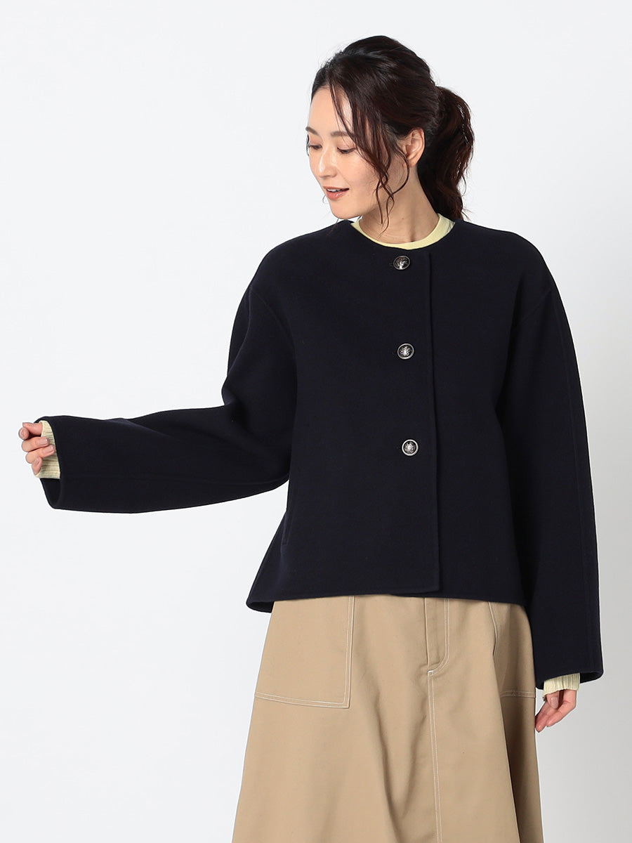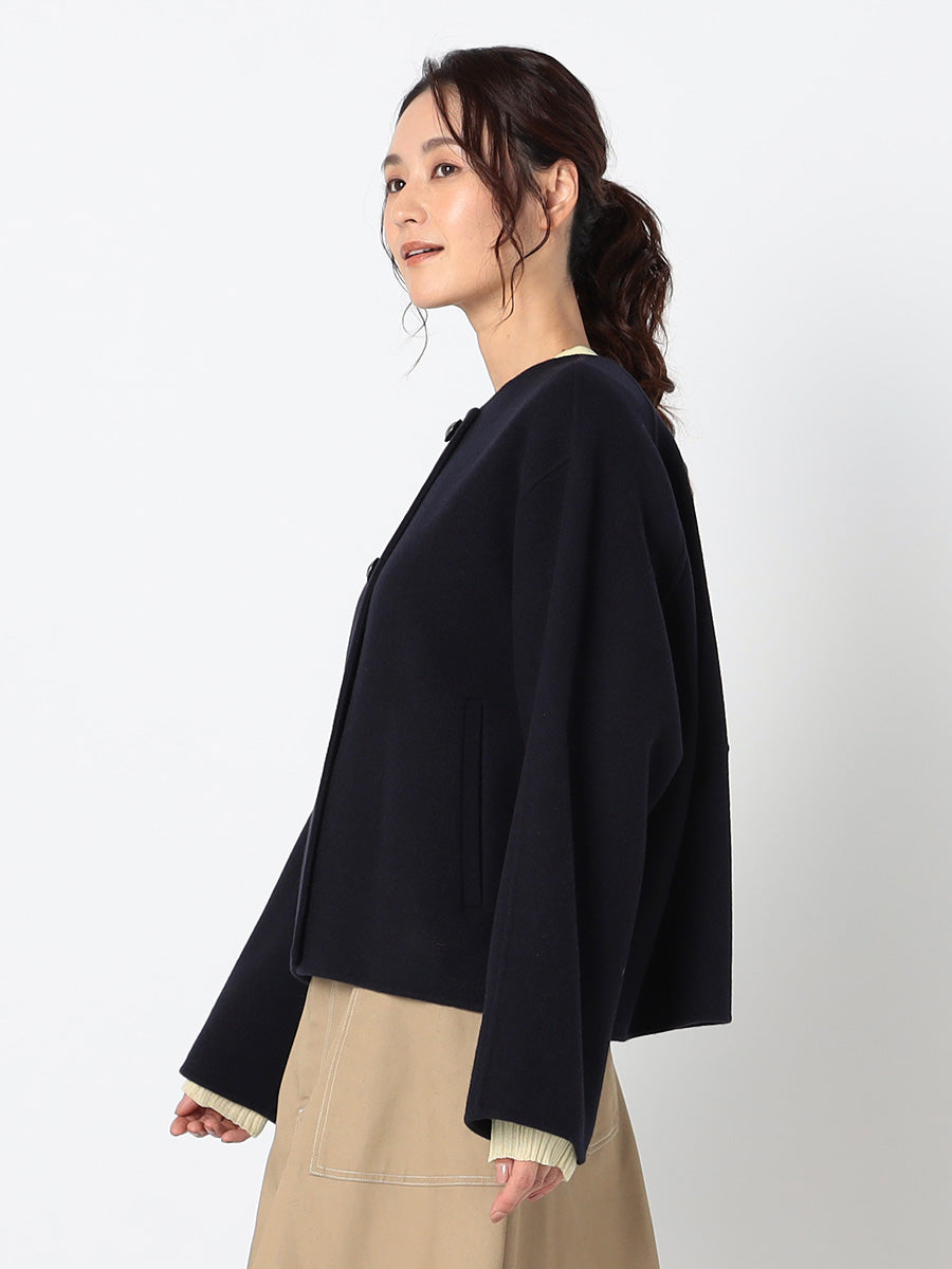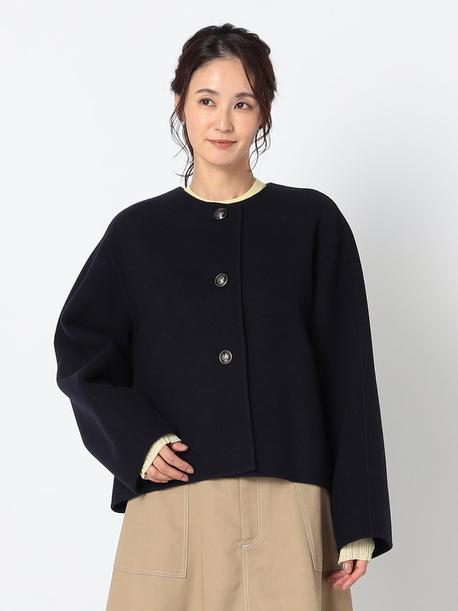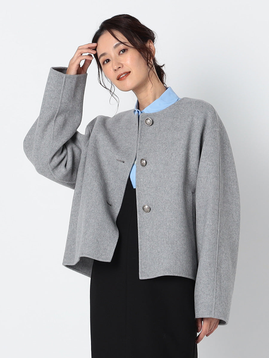 バックスタイルの立体的なフォルムが魅力のノーカラーアウター。フロントの釦がアクセントになったトレンド感のあるショートレングス。合わせるアイテムを選らばず、ワイドパンツや、ボリュームのあるスカートもスタイリングのバランスが取りやすく上品な印象でお召し頂けます。また身頃と袖はゆとりのあるサイズ感なので、ボリュームのあるトップスとも着ぶくれせずご着用いただけます。ブルゾンのように軽く羽織っていただけるおすすめアイテムです。カラーは、女性らしい印象のベージュ(#033)、トレンド感増すライトグレー(#003)、ベーシックなダークネイビーの3色展開です。