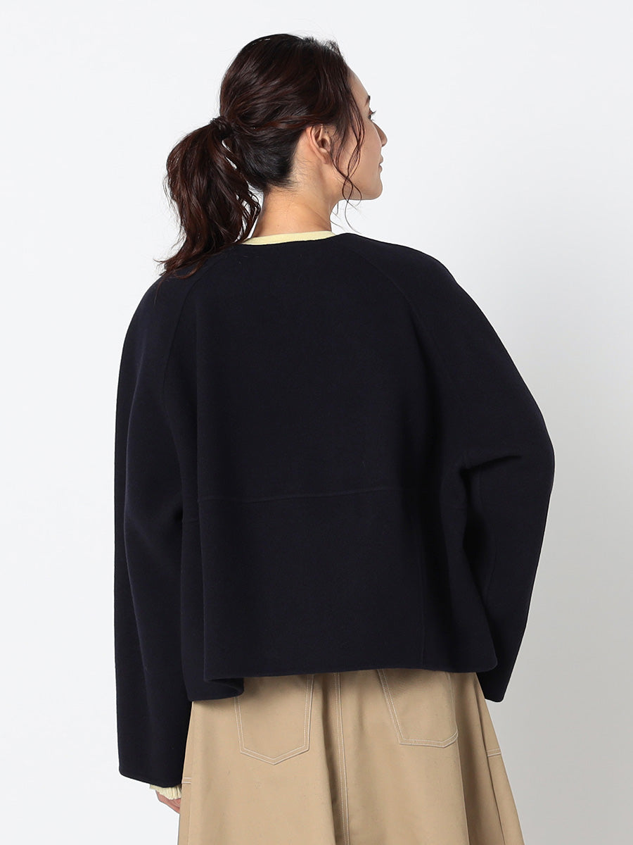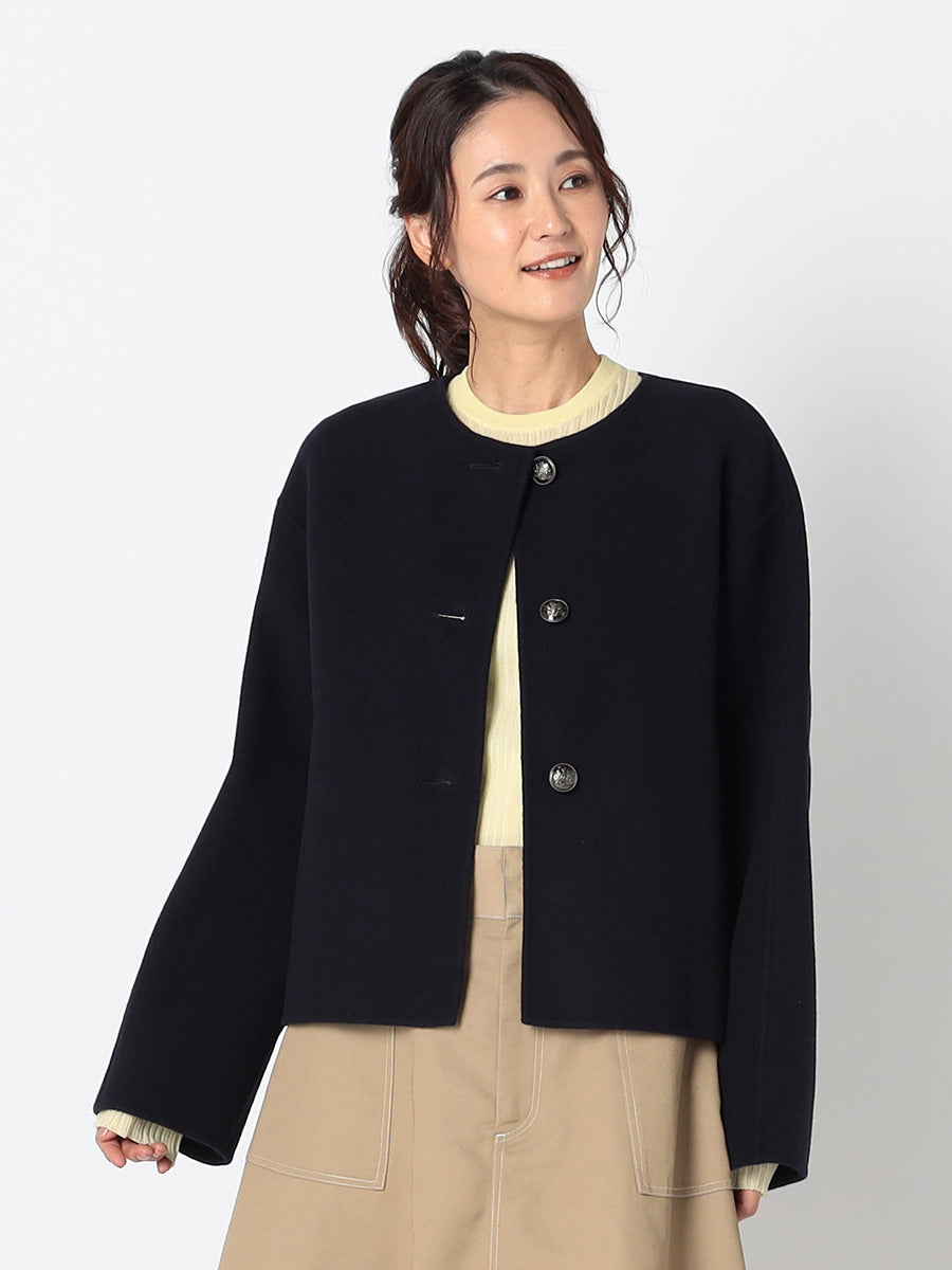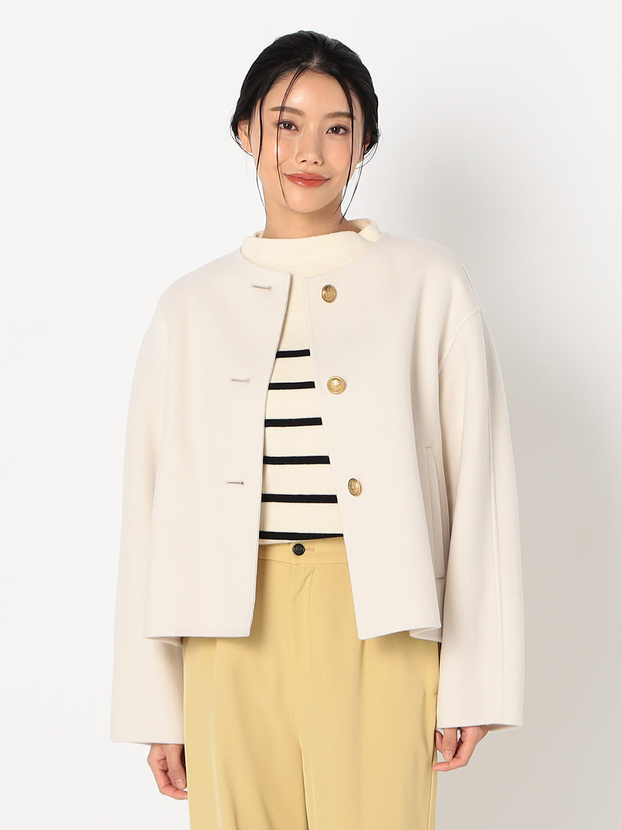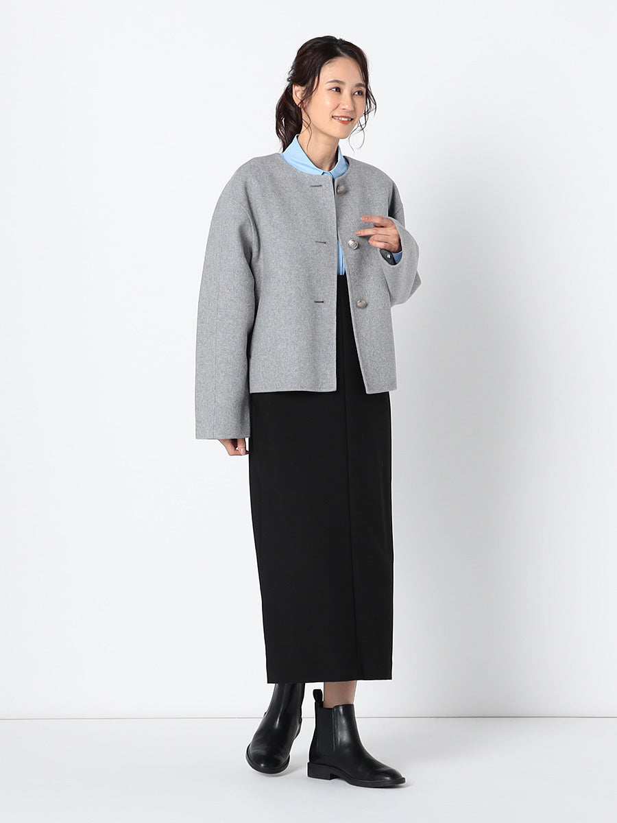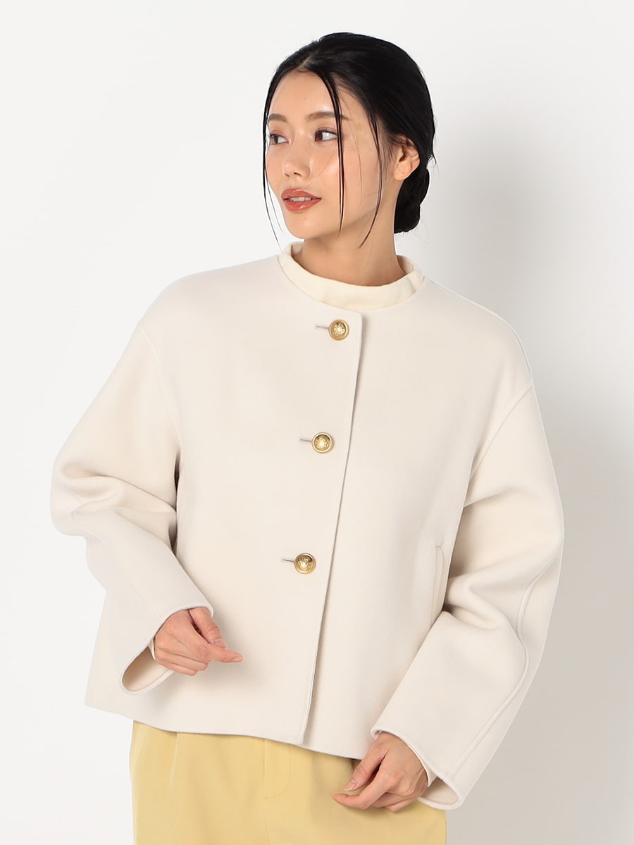 バックスタイルの立体的なフォルムが魅力のノーカラーアウター。フロントの釦がアクセントになったトレンド感のあるショートレングス。合わせるアイテムを選らばず、ワイドパンツや、ボリュームのあるスカートもスタイリングのバランスが取りやすく上品な印象でお召し頂けます。また身頃と袖はゆとりのあるサイズ感なので、ボリュームのあるトップスとも着ぶくれせずご着用いただけます。ブルゾンのように軽く羽織っていただけるおすすめアイテムです。カラーは、女性らしい印象のベージュ(#033)、トレンド感増すライトグレー(#003)、ベーシックなダークネイビーの3色展開です。