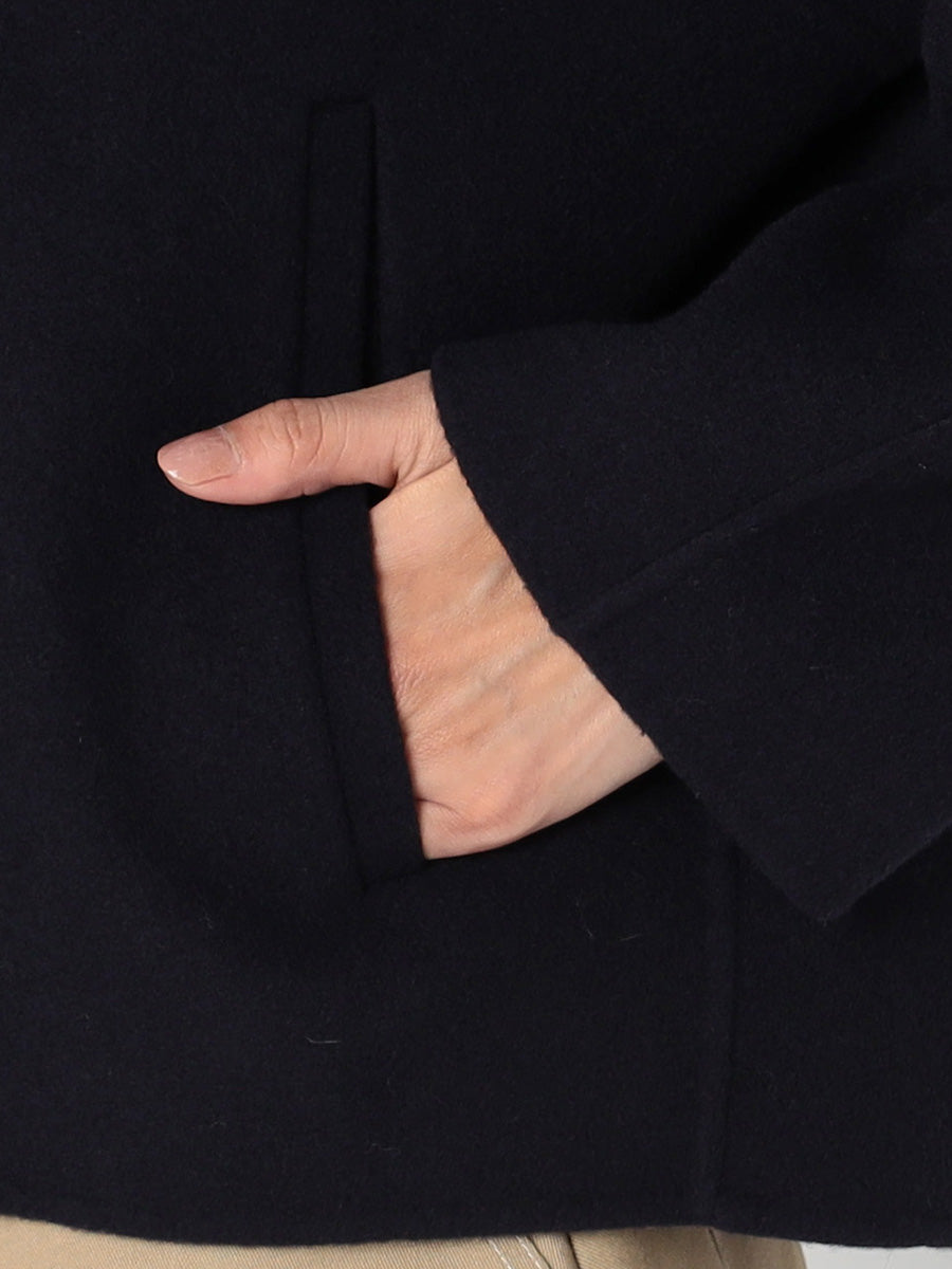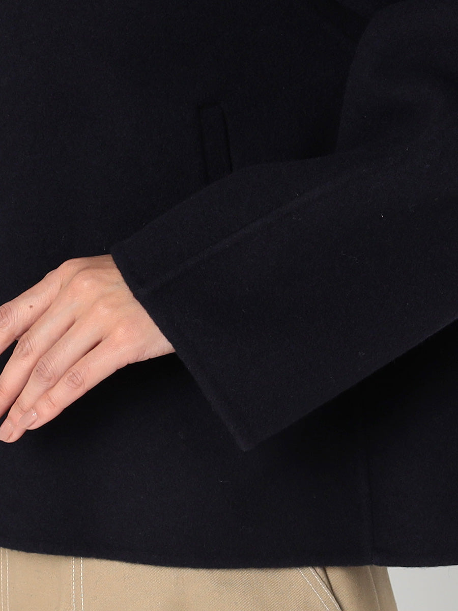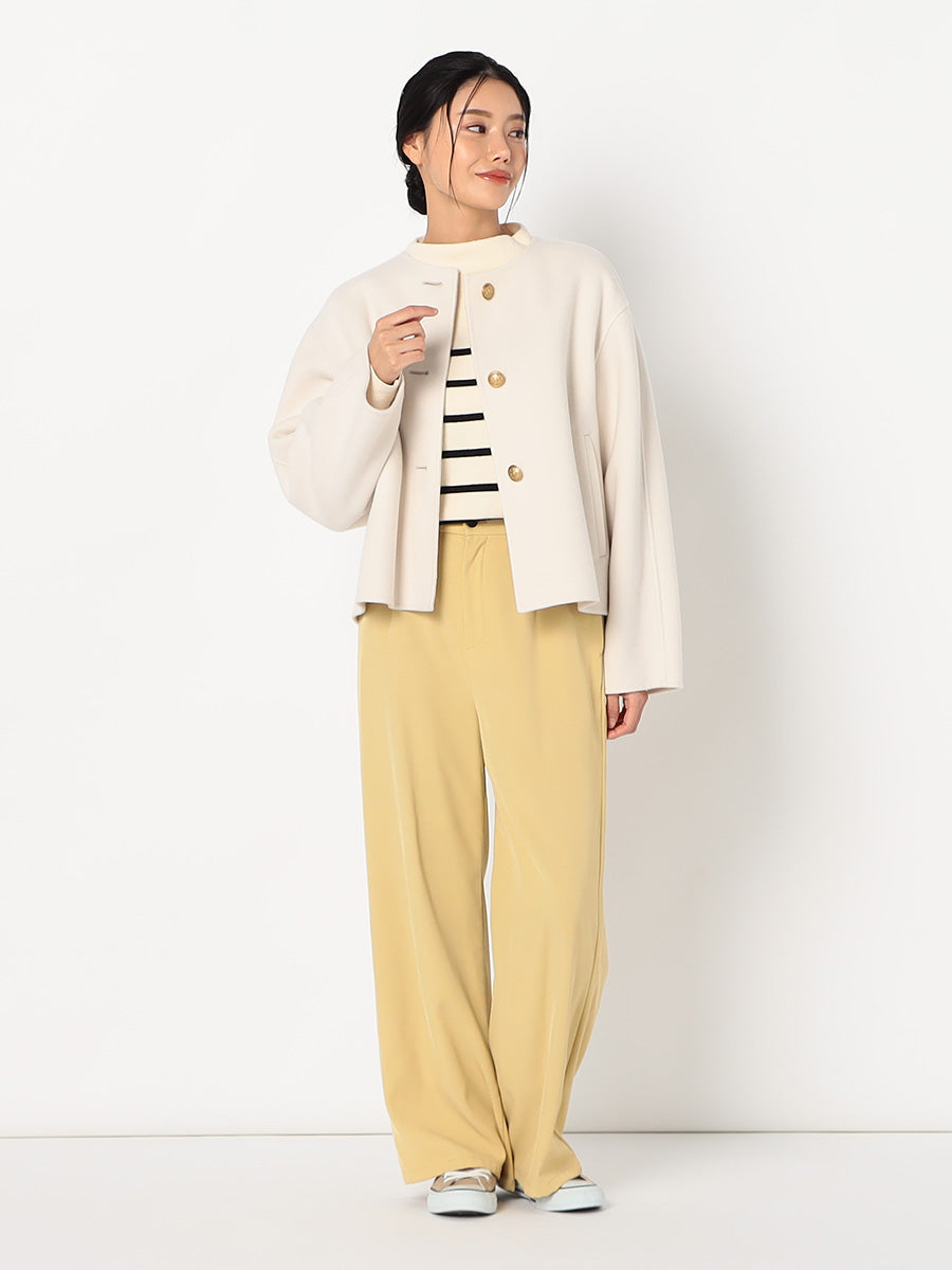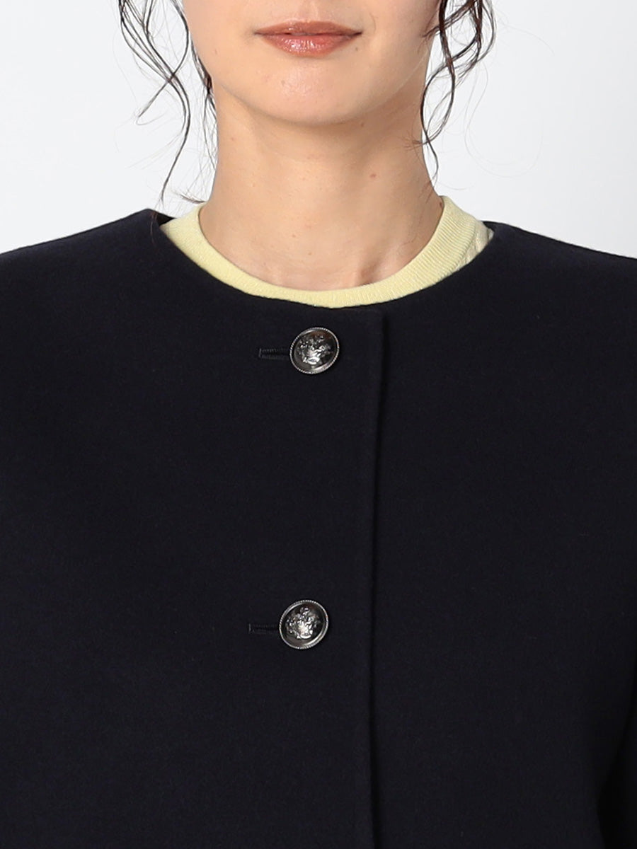 バックスタイルの立体的なフォルムが魅力のノーカラーアウター。フロントの釦がアクセントになったトレンド感のあるショートレングス。合わせるアイテムを選らばず、ワイドパンツや、ボリュームのあるスカートもスタイリングのバランスが取りやすく上品な印象でお召し頂けます。また身頃と袖はゆとりのあるサイズ感なので、ボリュームのあるトップスとも着ぶくれせずご着用いただけます。ブルゾンのように軽く羽織っていただけるおすすめアイテムです。カラーは、女性らしい印象のベージュ(#033)、トレンド感増すライトグレー(#003)、ベーシックなダークネイビーの3色展開です。