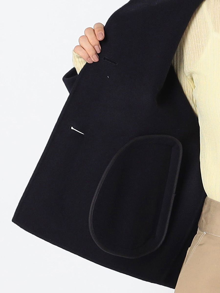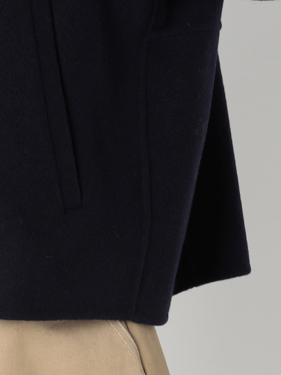 ウール本来の上質感をより追求した超極細番手ウールsuper140原料を使用しており、 天然繊維特有のしっとり感や、やさしい暖かさを感じて頂けます。 (ナイロンは素材の強度と発色性を上げるために使用しており、混用率,ウール90%ナイロン10%はコート地としての黄金比率です。) 二重織にすることで膨らみを持たせたながらも、重すぎない設計に織りあげて、仕上げ加工は、ハリ感がありつつも柔らかさを兼ね備えた起毛メルトン仕上げにしております。 国内のウール産地で有名な、尾州の素材です。