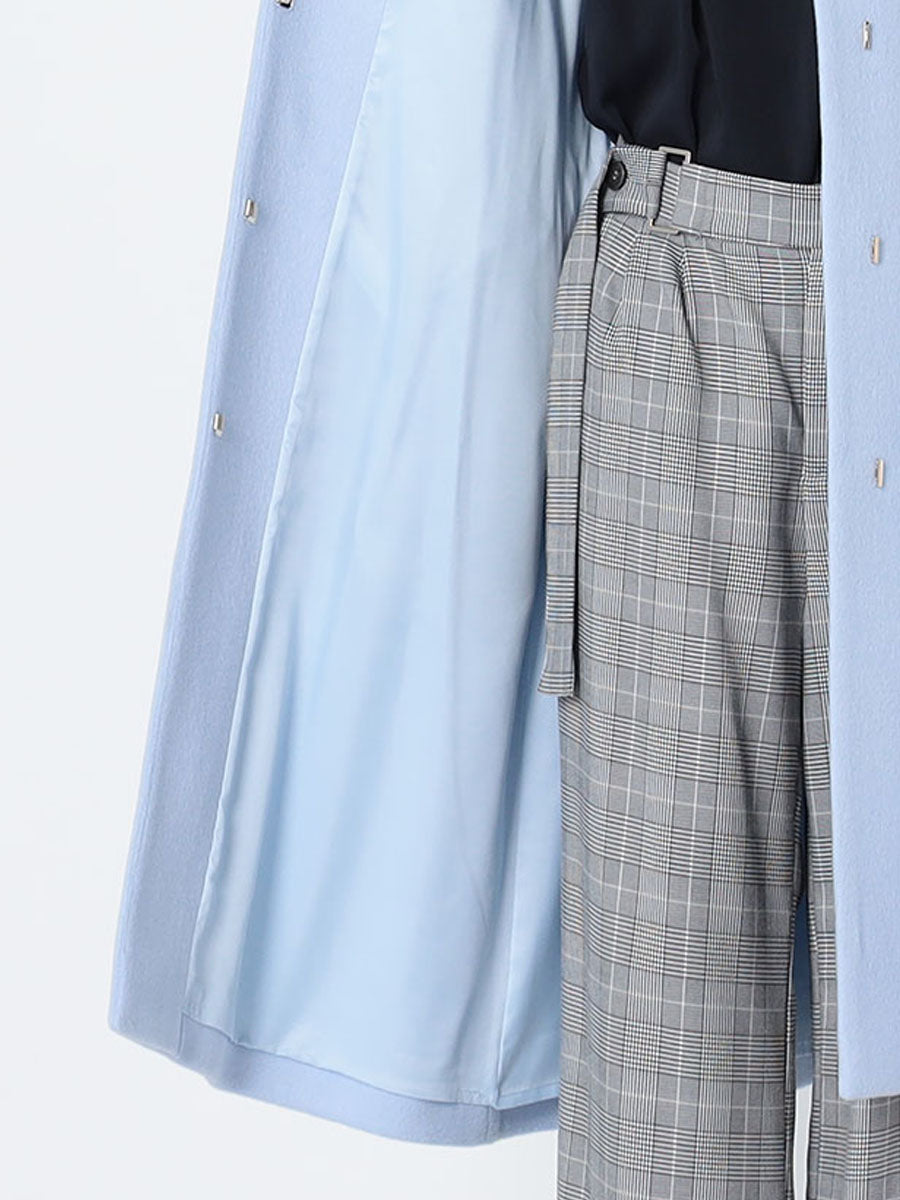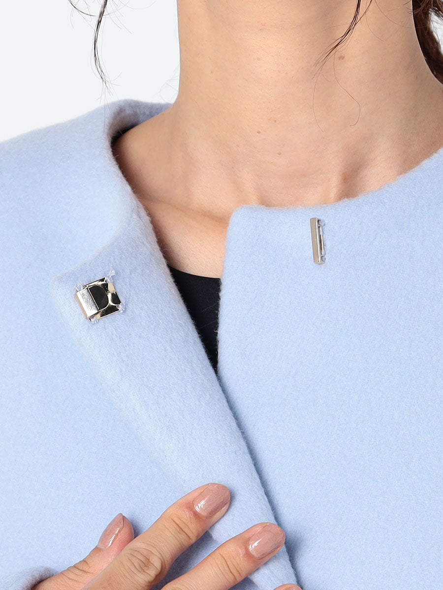 CELFORD定番のノーカラーコート。今季も幅広いコーディネートに合わせやすい、ベーシックでミニマルなデザインをそのままに展開しています。今季は前明きの付属にメタルホックを採用。開けて着用した際もホックが上品なアクセントになり華やかさをプラスします。上質なウールにカシミヤをブレンドすることで、しなやかさも感じさせる柔らかさと上品な艶感を出しました。毛並みを一方向にプレスして揃えるビーバー仕上げを施し、裏面も同様にビーバー仕上げを施している為、ふくらみ感と柔らかさが足され温かみのある素材に仕上げています。
