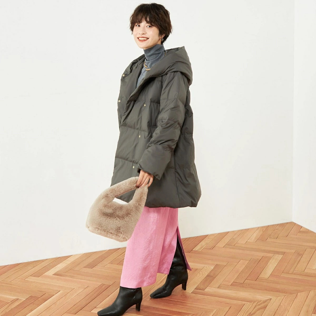 ・ショールカラー風のフードが顔周りを華やかに