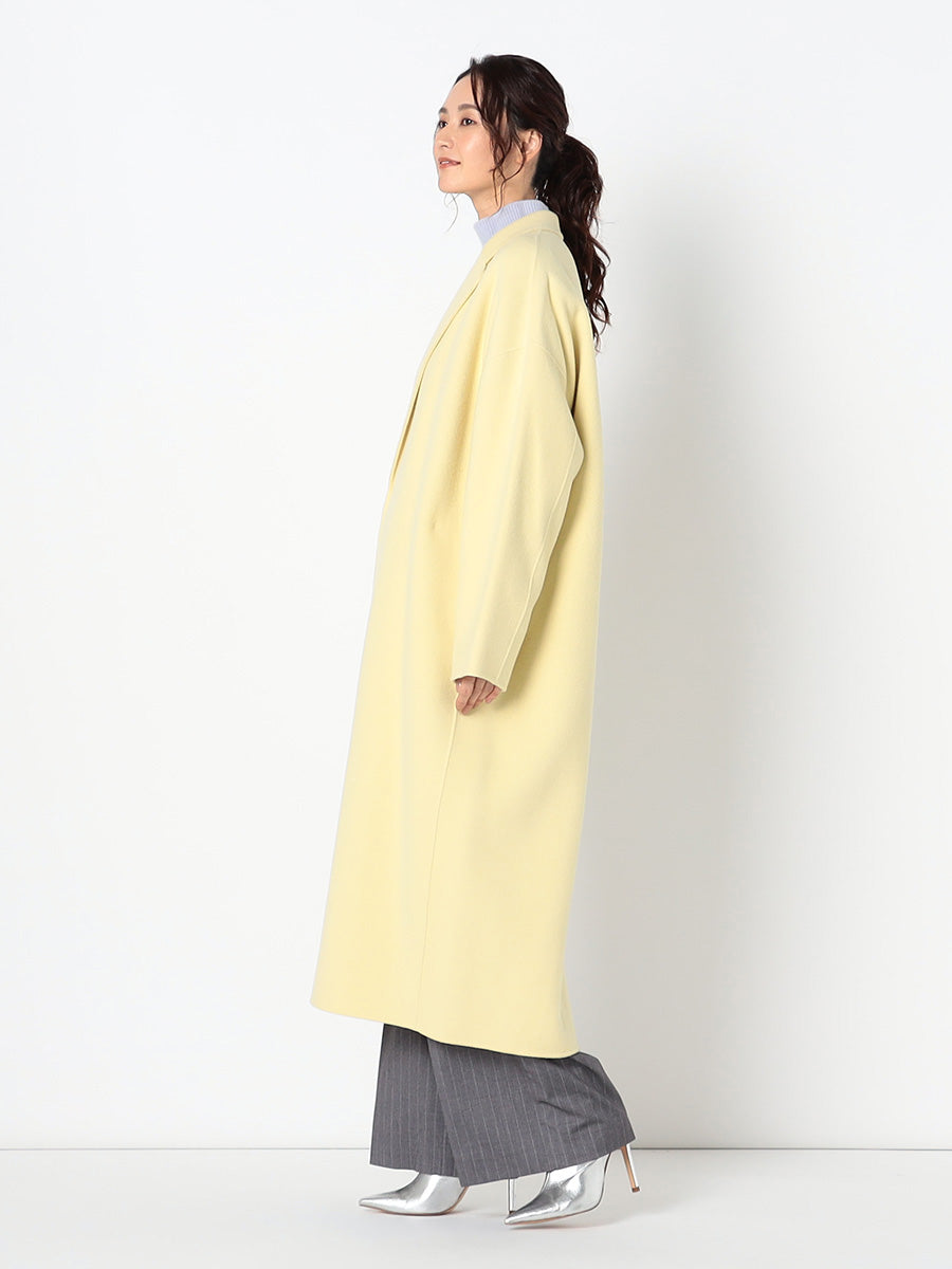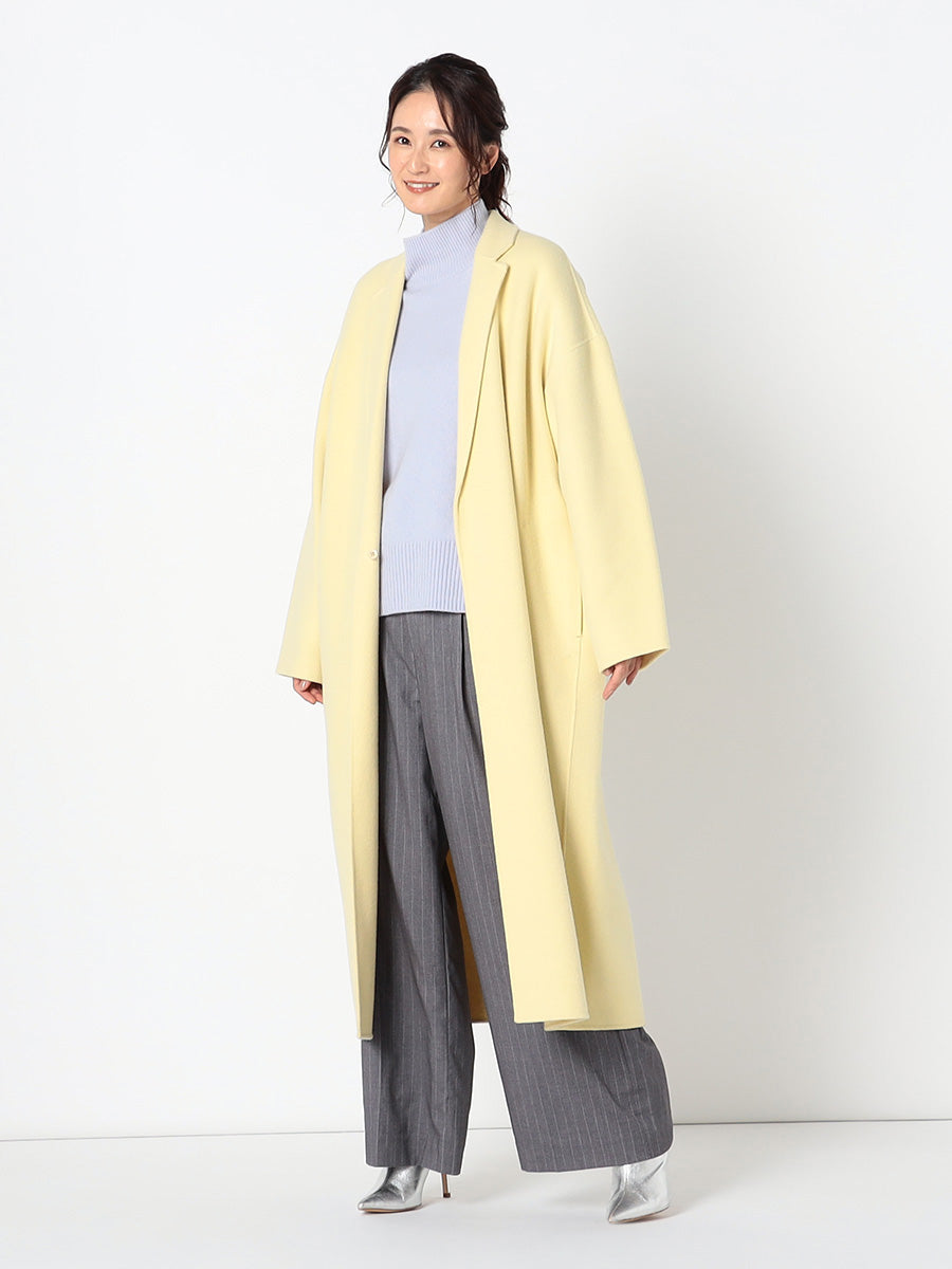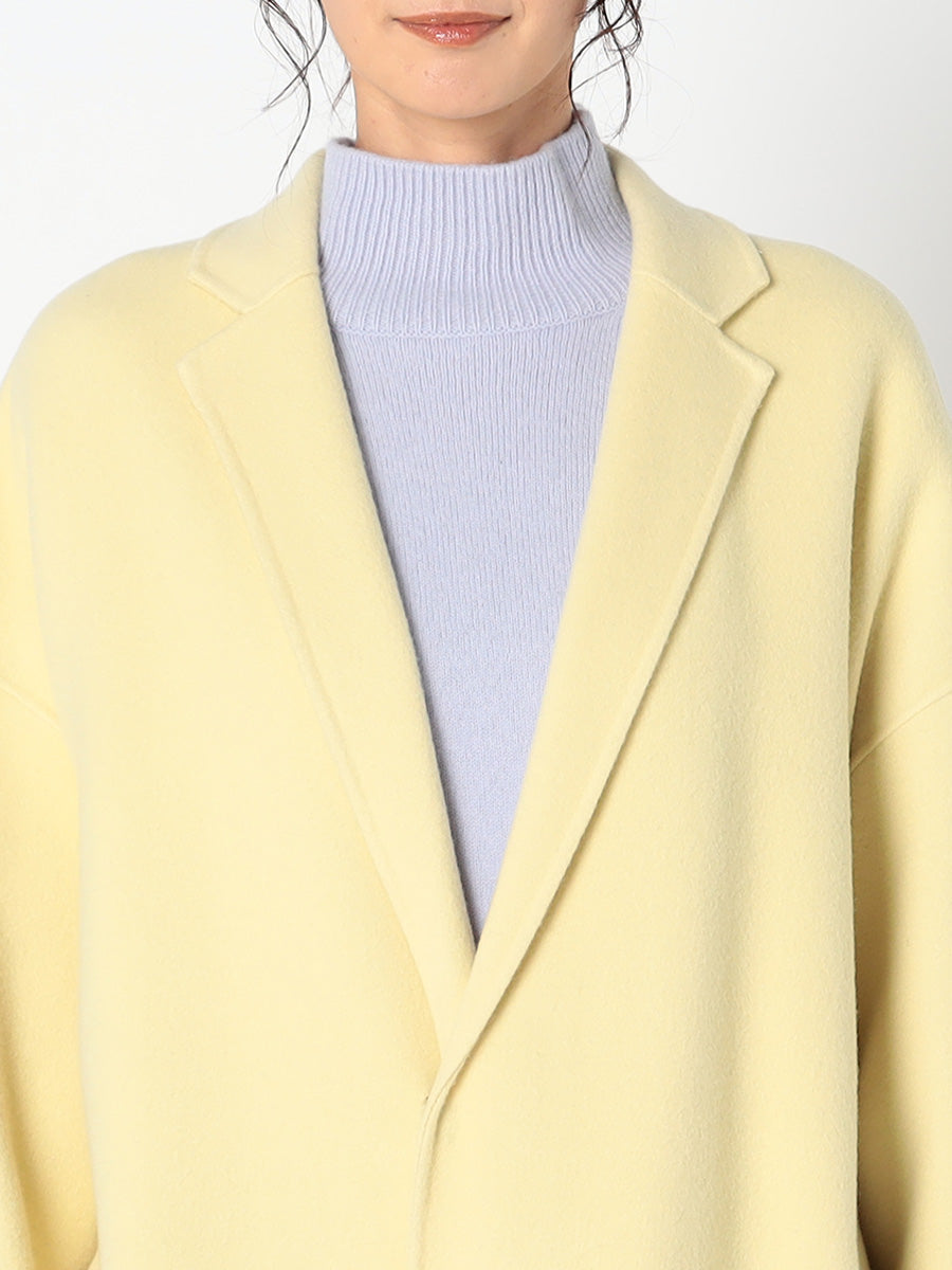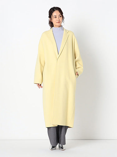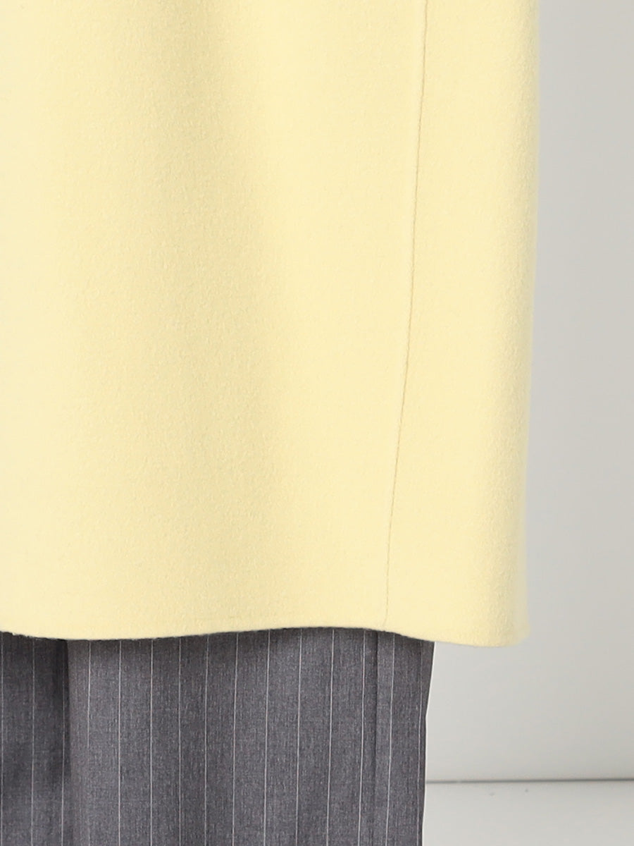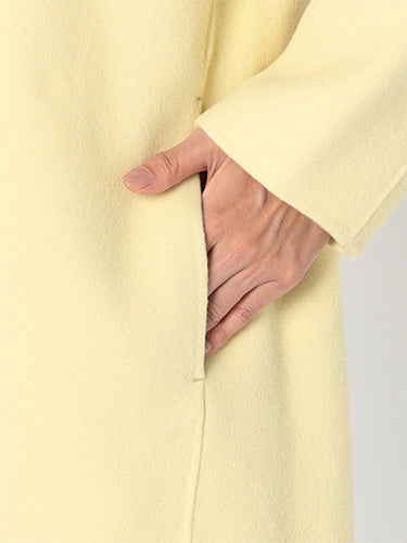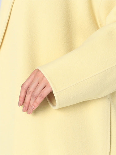 ■デザイン 細めのラペルでモダンに仕上げたコクーンシルエットのチェスターコート。 ドロップした肩、アームホールから袖にかけてのラインにはとことんこだわり、理想とする丸みのある構築的なシルエットを追求。 シンプルなのにさっと羽織るだけで様になる美しいコートは、綿密にパターンメイクされたフォルムと、リバーならではの美しい縫製技術のなせる業。 フロントには目立たないホック付き。留めて着たいときは前がはだけすぎないようタブを付けるなど、uncraveらしい隠れた配慮もポイントです。 ■素材 白度の高いピーセス(羊のきれいな部分)と、柔らかさと膨らみが特徴のラムをMIXした原料を使用。 接結糸にもウールの梳毛を使用したこだわりの二重織素材で、しっかりとした生地厚を実現。 コートにはうれしい抗菌防臭機能付き。 ■カラー:イエロー(042)