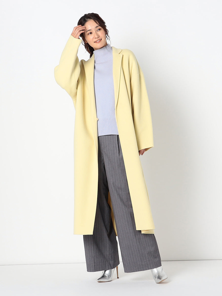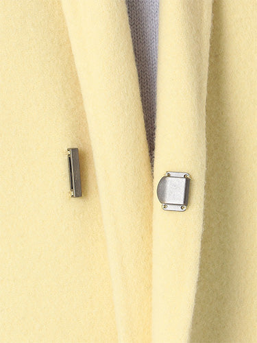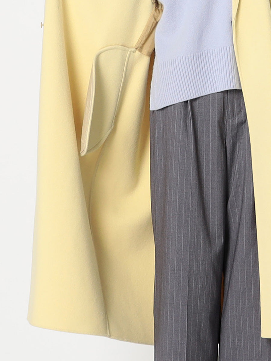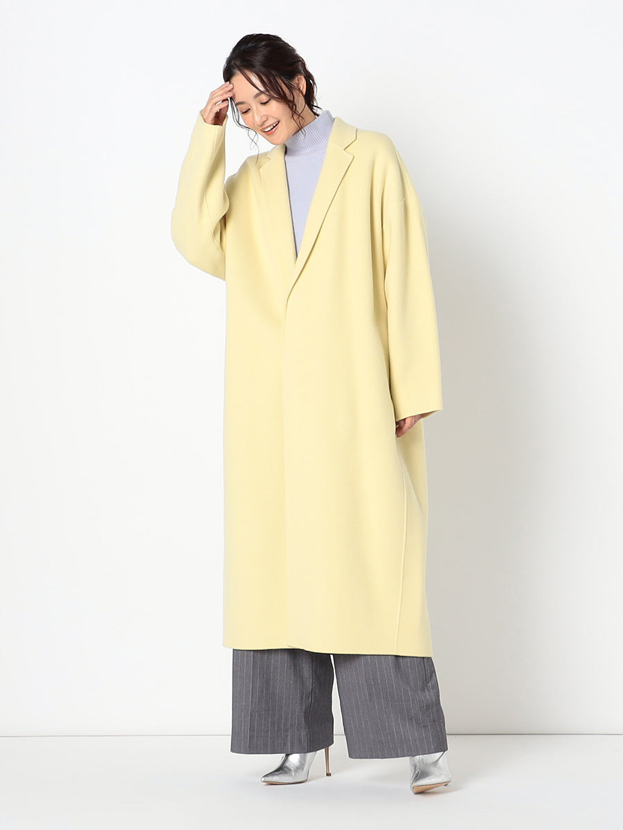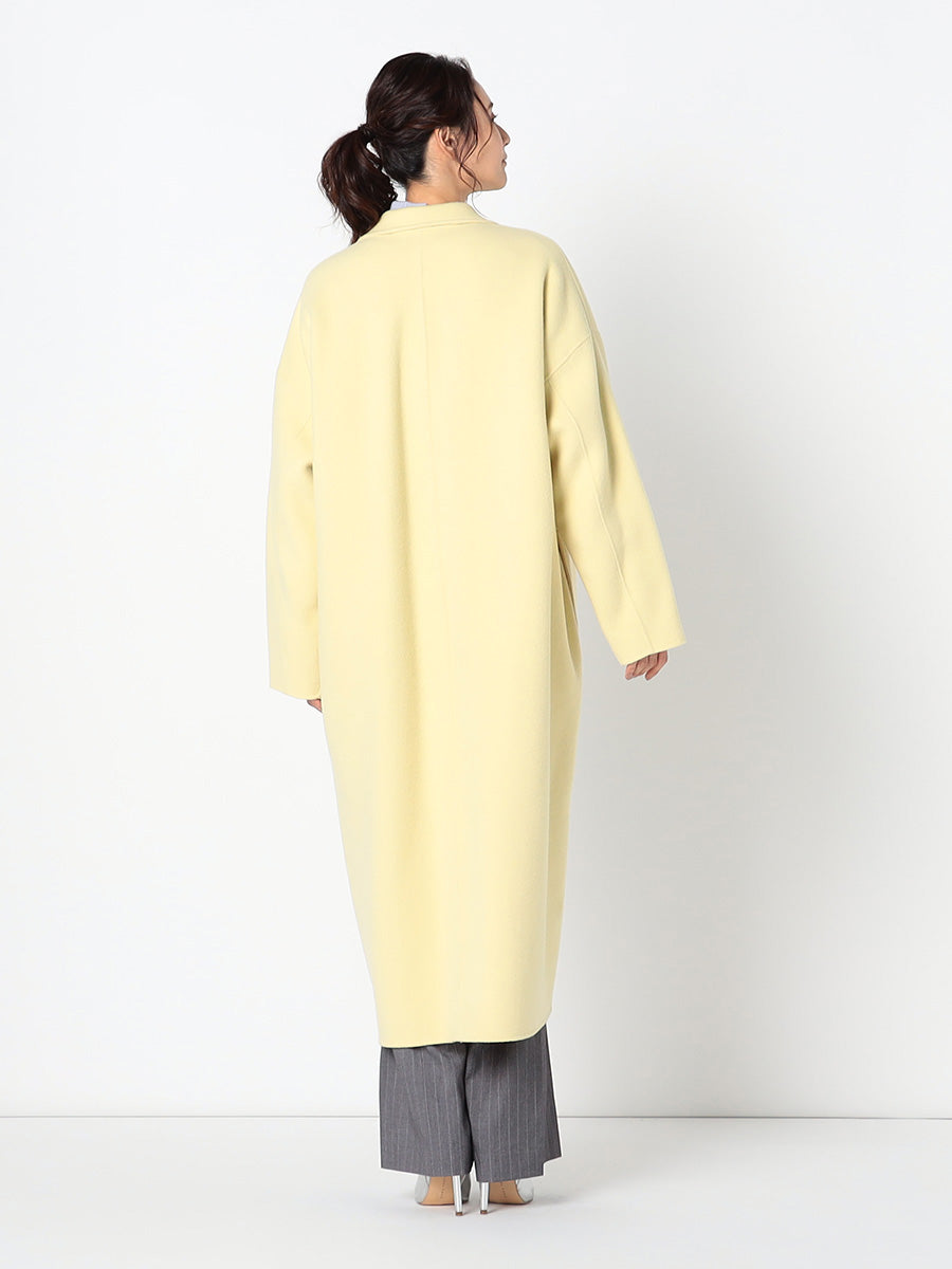 ■デザイン 細めのラペルでモダンに仕上げたコクーンシルエットのチェスターコート。 ドロップした肩、アームホールから袖にかけてのラインにはとことんこだわり、理想とする丸みのある構築的なシルエットを追求。 シンプルなのにさっと羽織るだけで様になる美しいコートは、綿密にパターンメイクされたフォルムと、リバーならではの美しい縫製技術のなせる業。 フロントには目立たないホック付き。留めて着たいときは前がはだけすぎないようタブを付けるなど、uncraveらしい隠れた配慮もポイントです。 ■素材 白度の高いピーセス(羊のきれいな部分)と、柔らかさと膨らみが特徴のラムをMIXした原料を使用。 接結糸にもウールの梳毛を使用したこだわりの二重織素材で、しっかりとした生地厚を実現。 コートにはうれしい抗菌防臭機能付き。 ■カラー:イエロー(042)