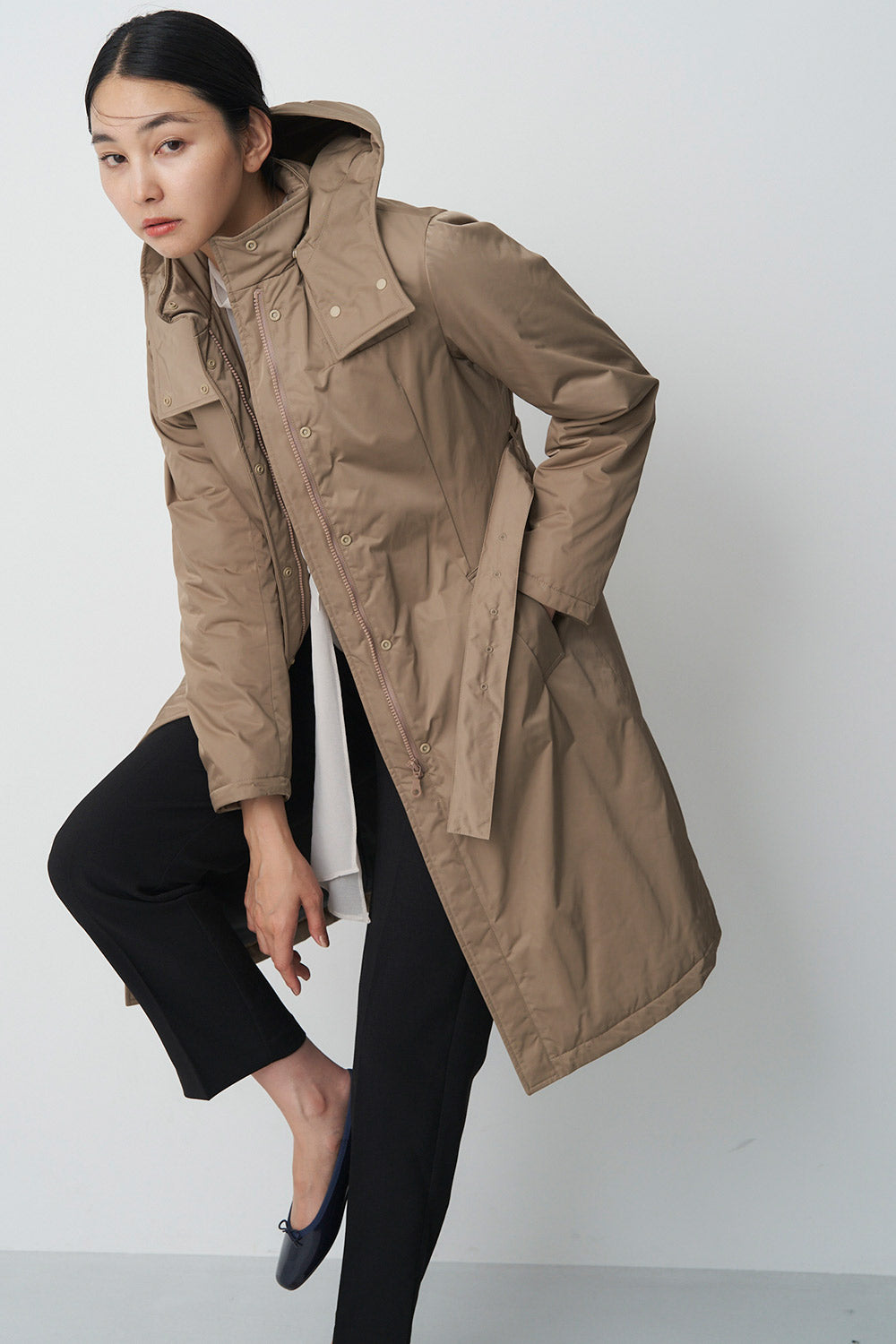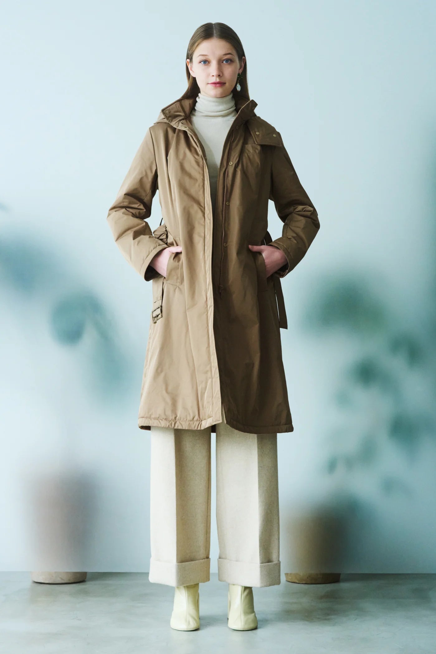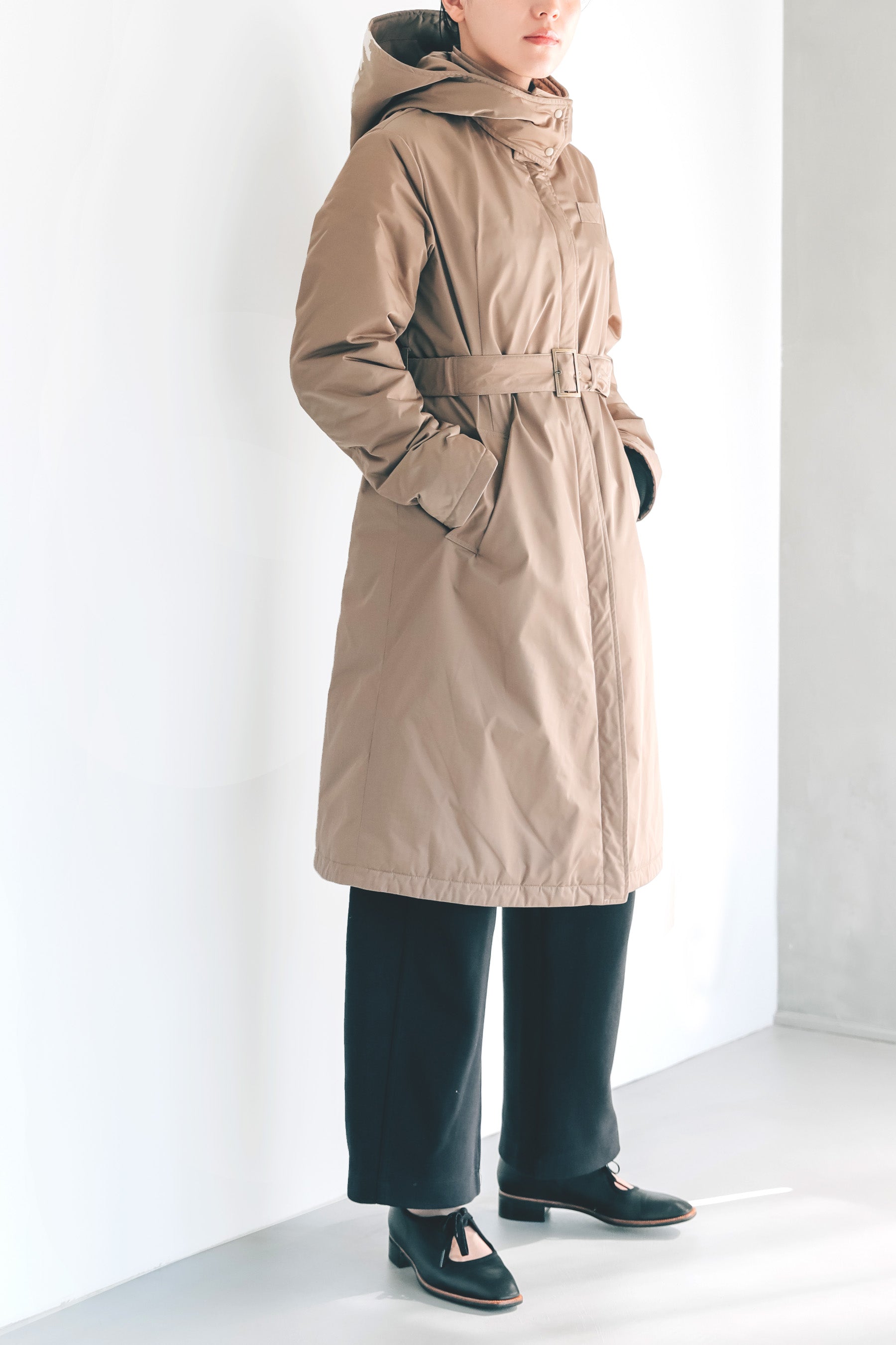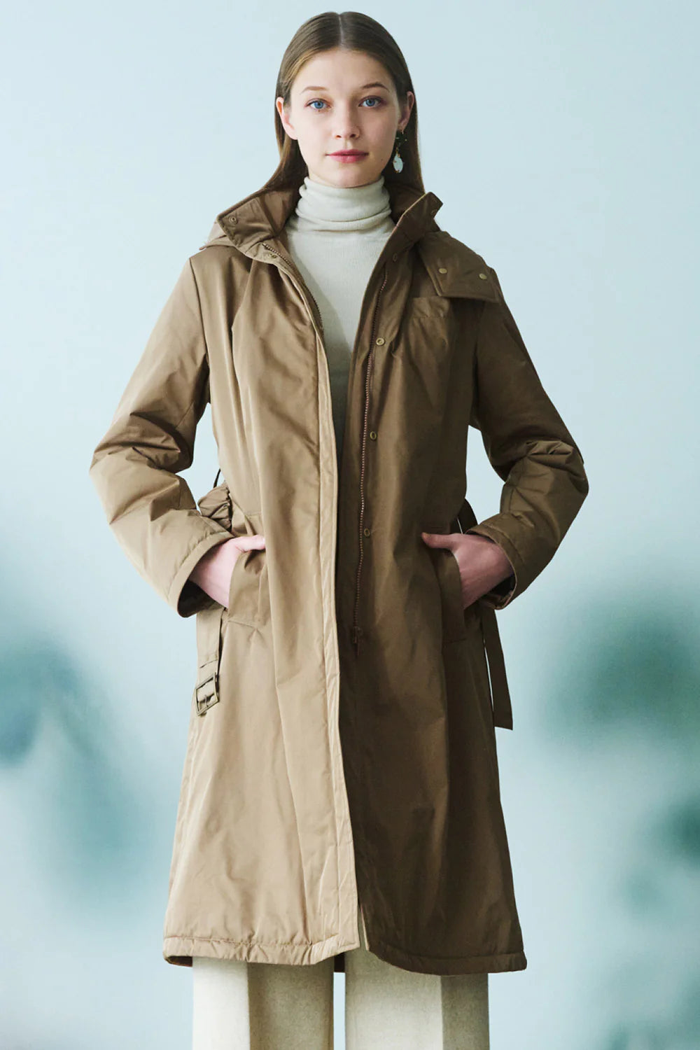 カポックダウンを使用したウエストベルトが付いた細見えするシルエットのフードコート。軽量だがダウンと同じ暖かさがあり、程よい光沢感のある上品な生地なのでかっちりにもカジュアルにもなる1着。