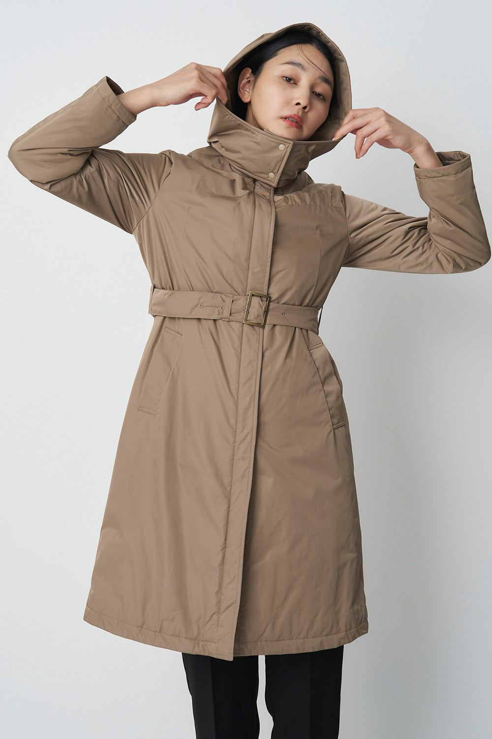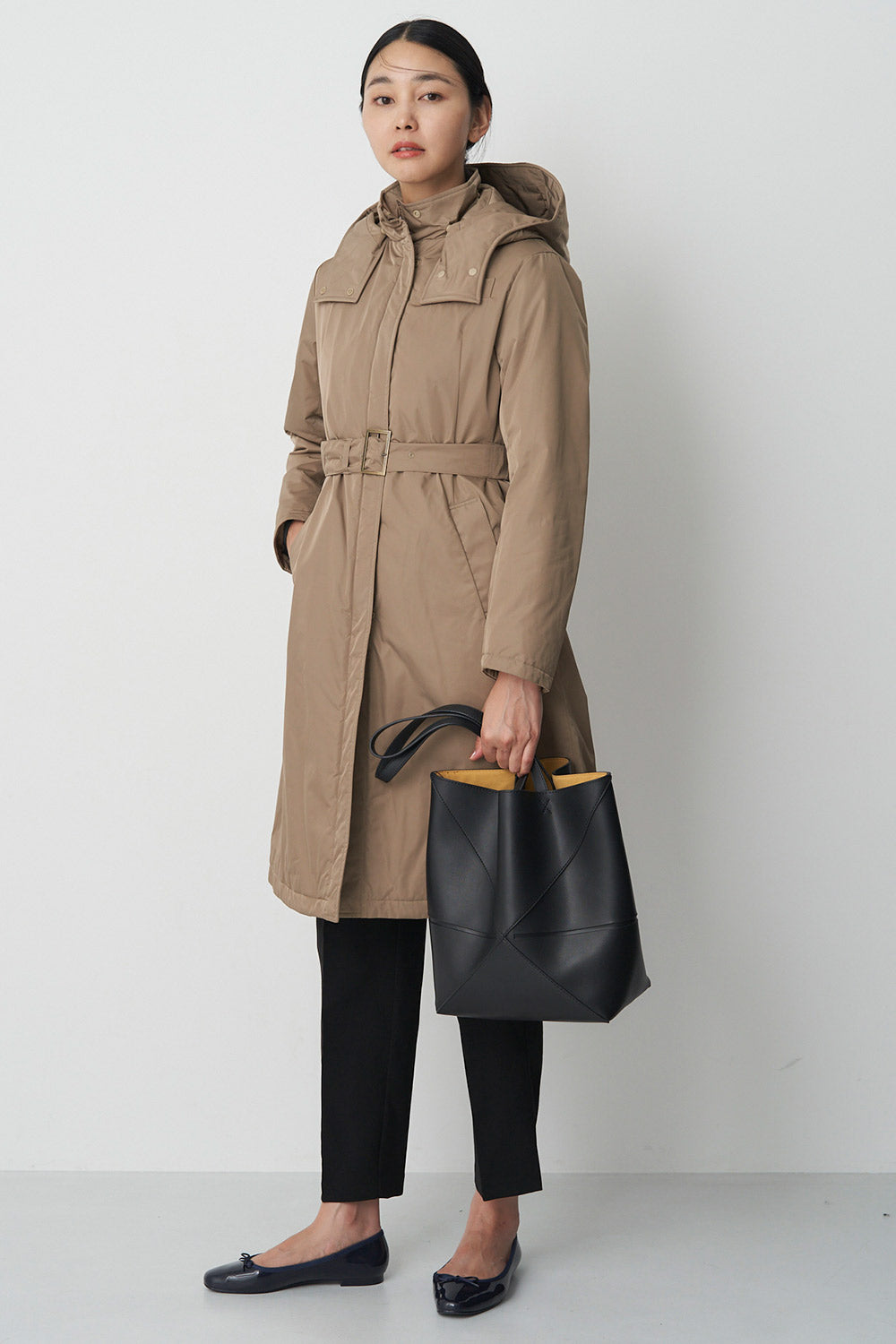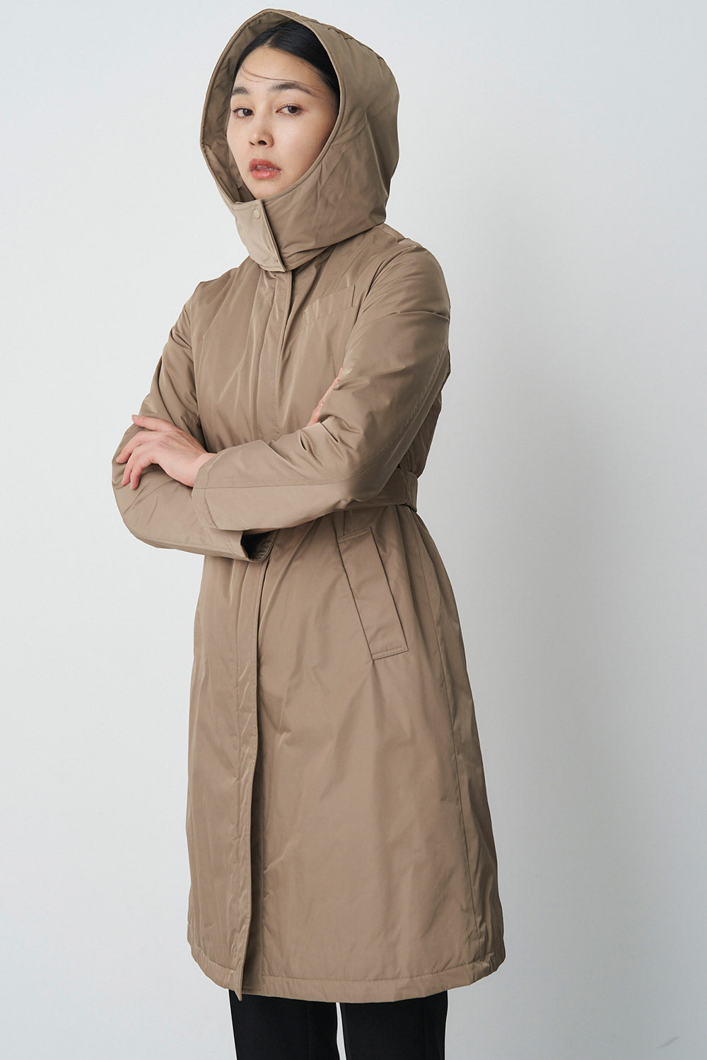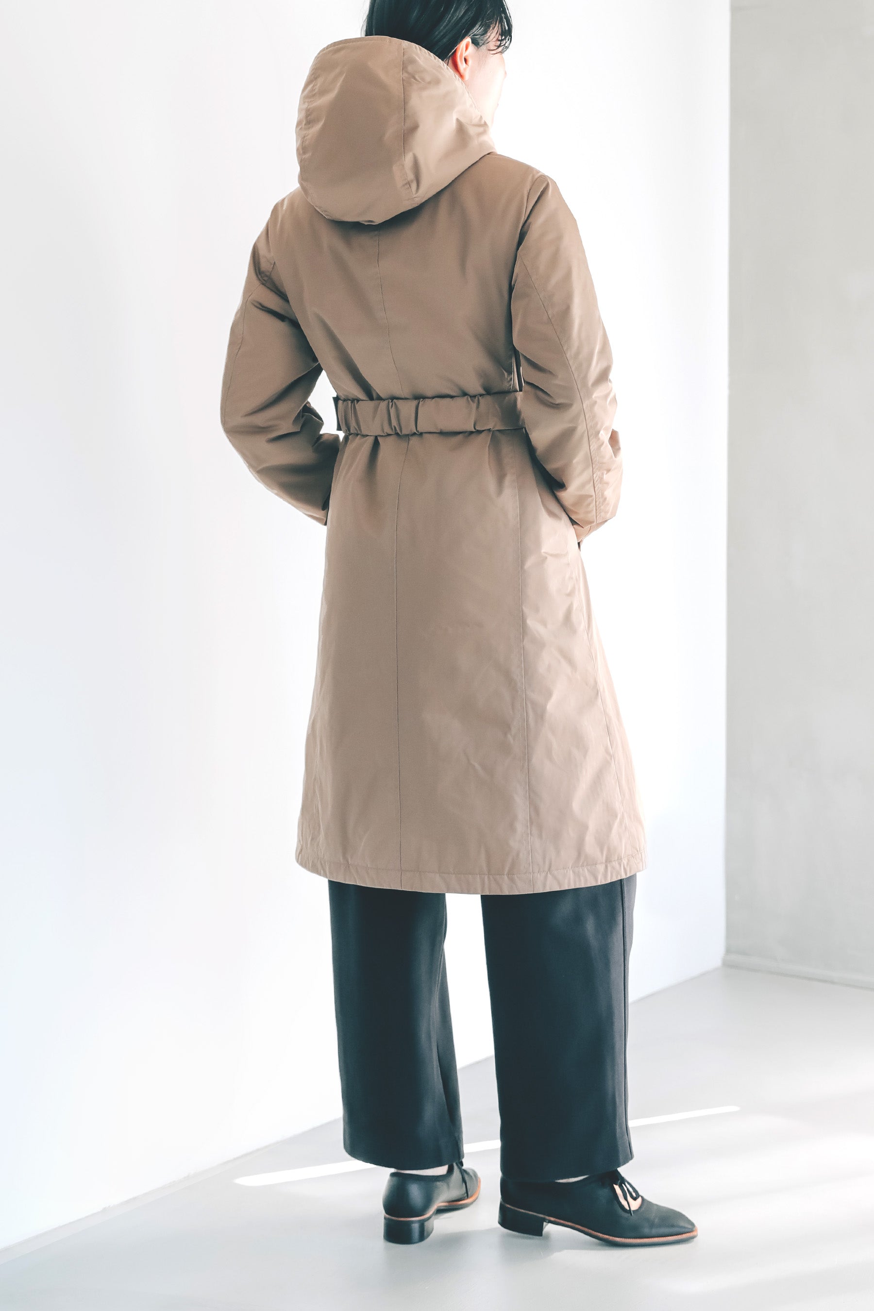 カポックダウンを使用したウエストベルトが付いた細見えするシルエットのフードコート。軽量だがダウンと同じ暖かさがあり、程よい光沢感のある上品な生地なのでかっちりにもカジュアルにもなる1着。