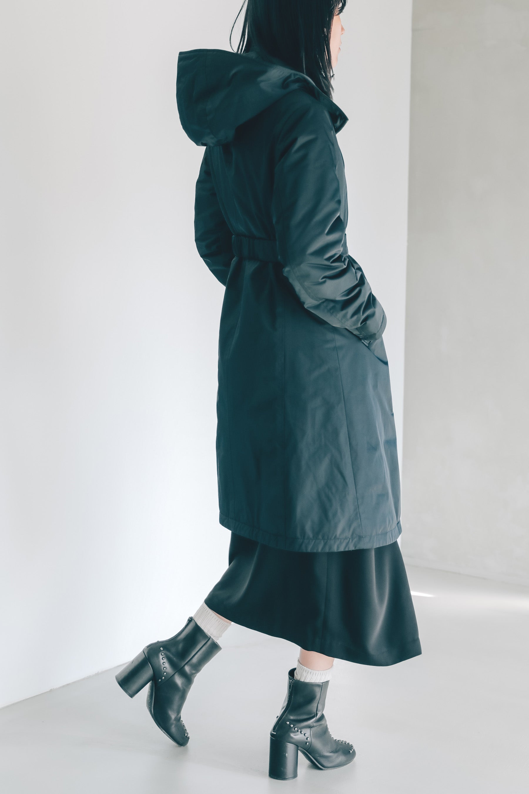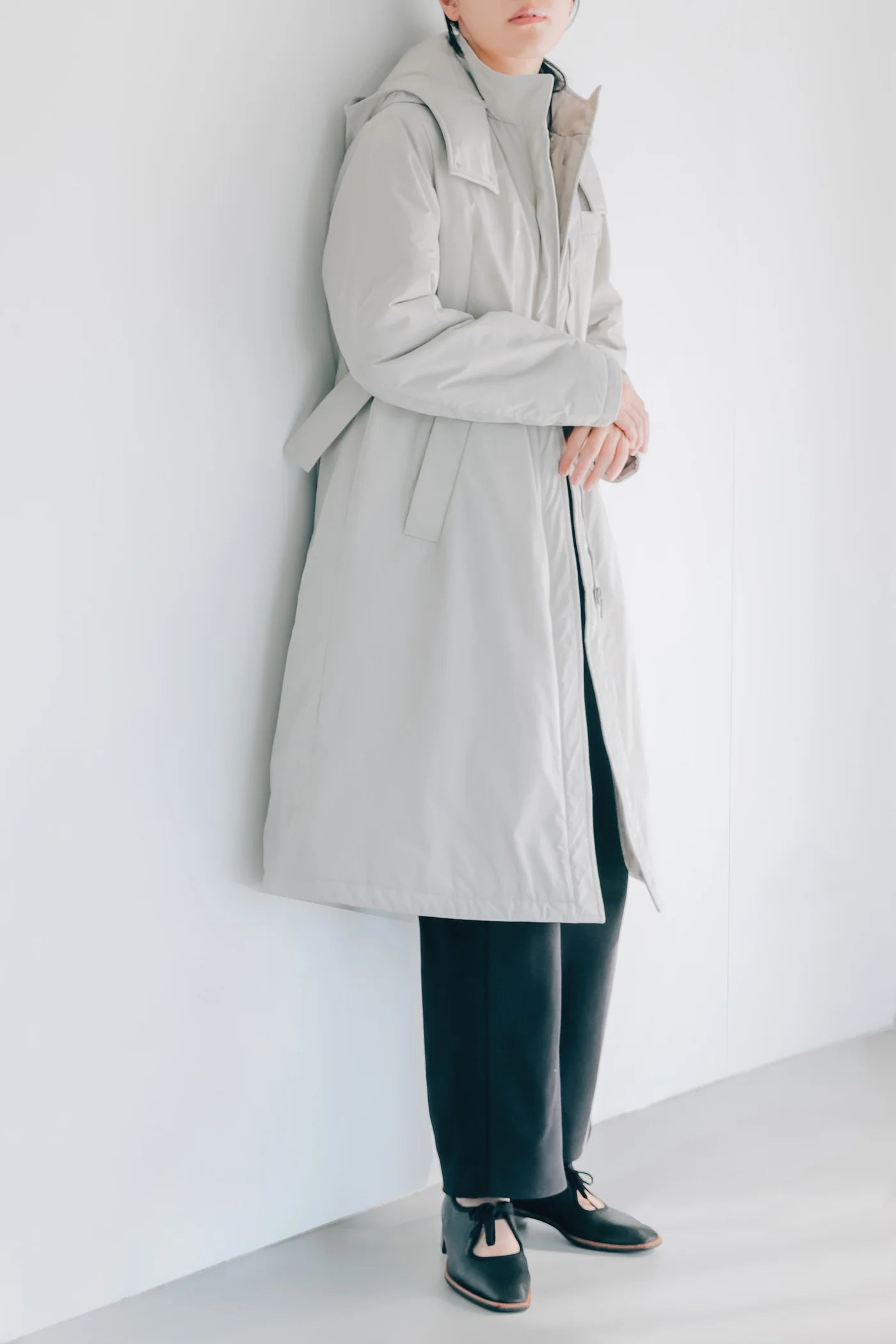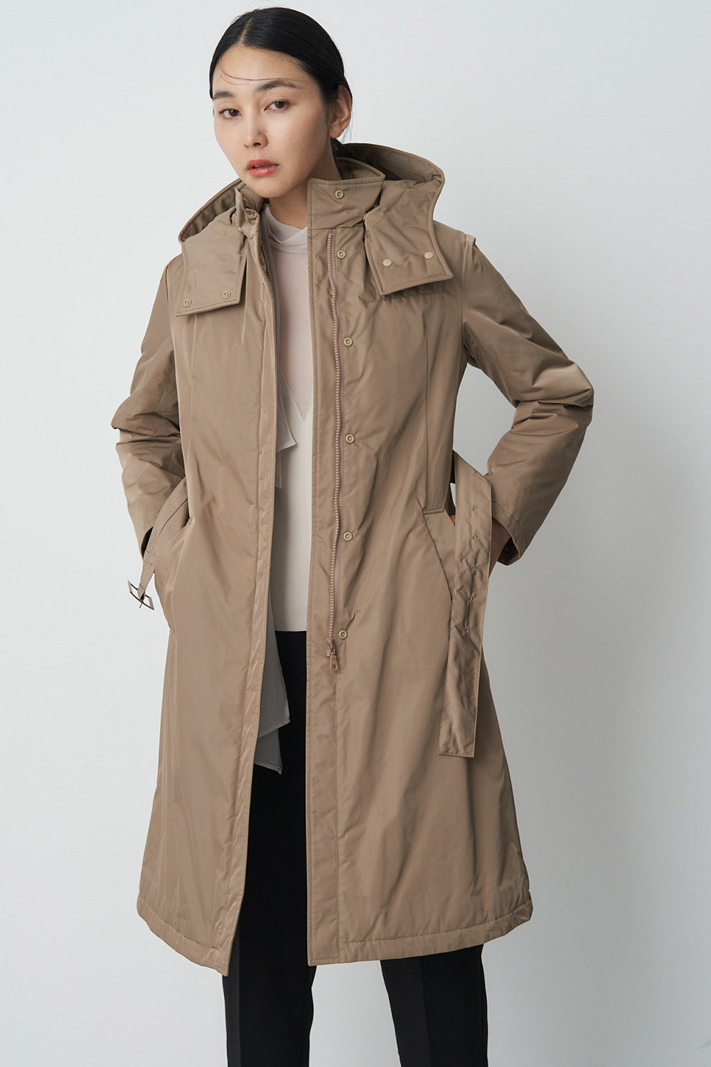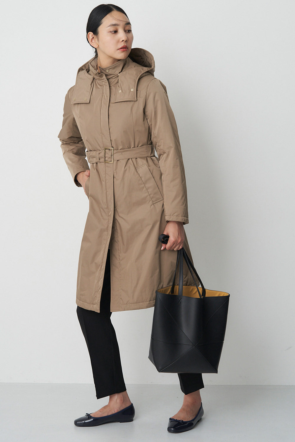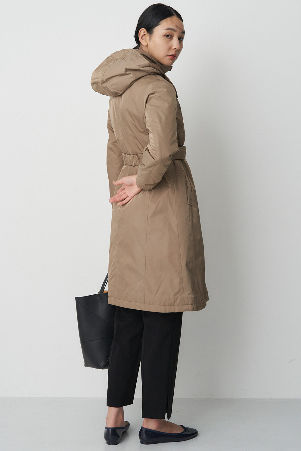 カポックダウンを使用したウエストベルトが付いた細見えするシルエットのフードコート。軽量だがダウンと同じ暖かさがあり、程よい光沢感のある上品な生地なのでかっちりにもカジュアルにもなる1着。