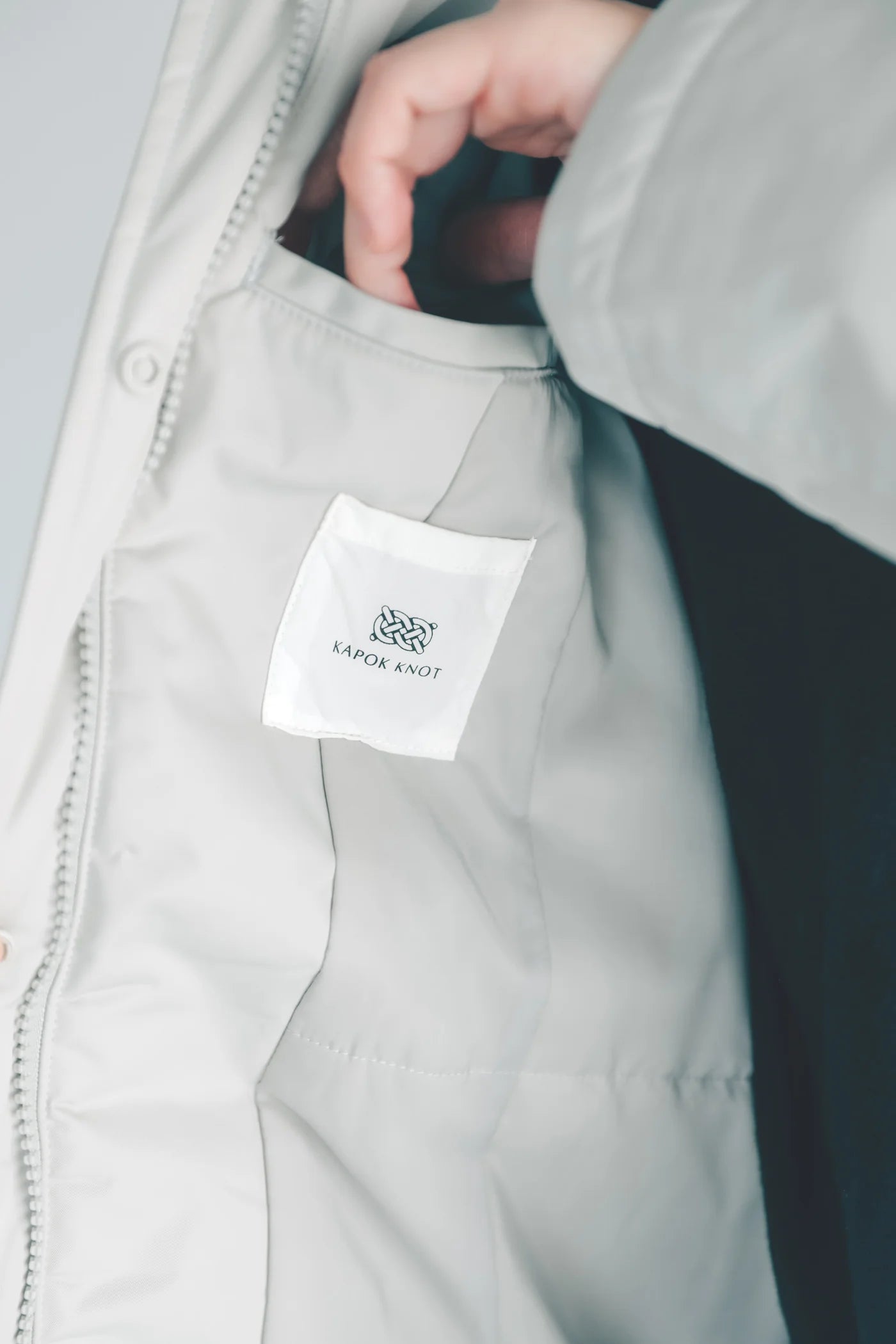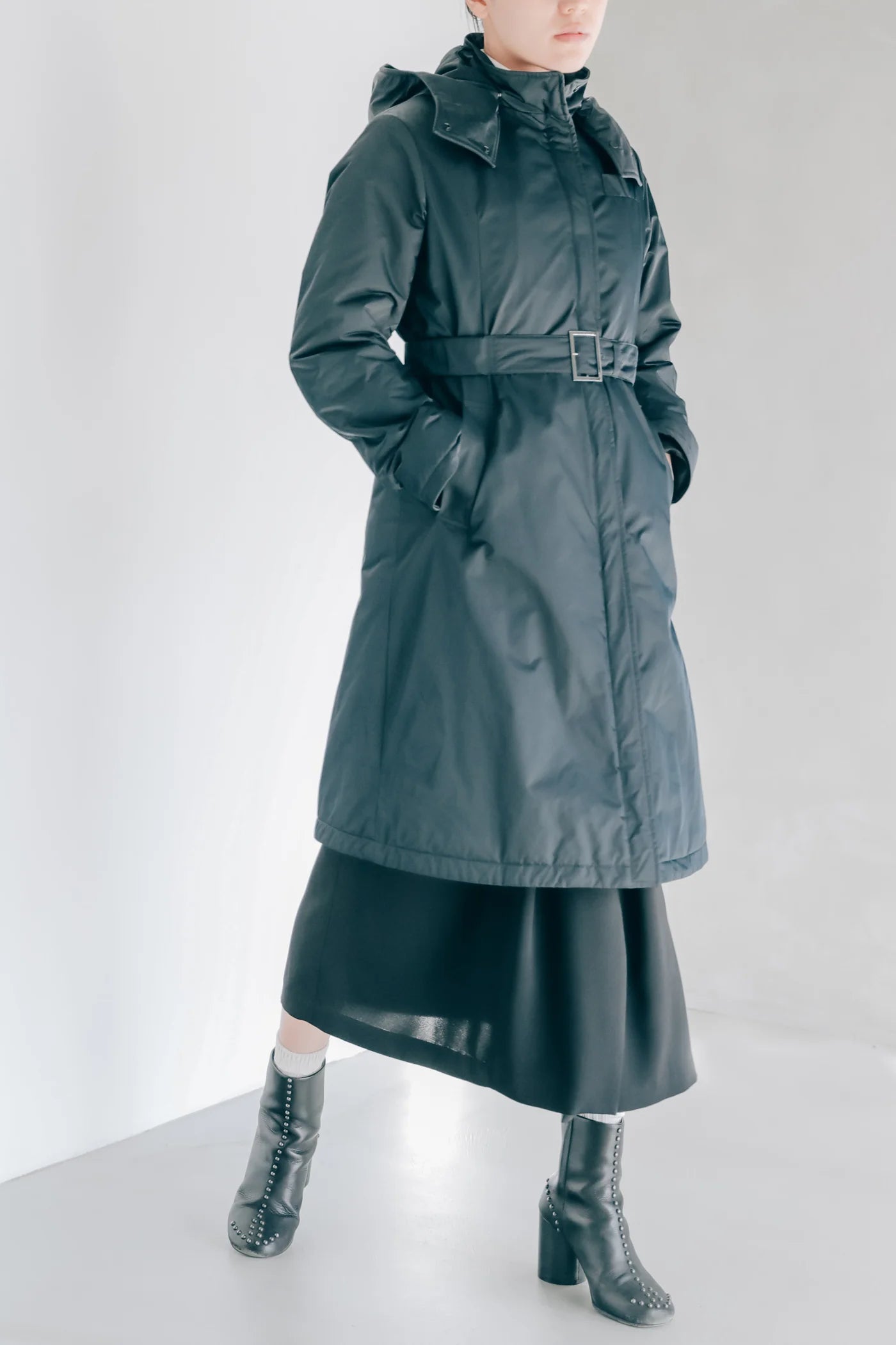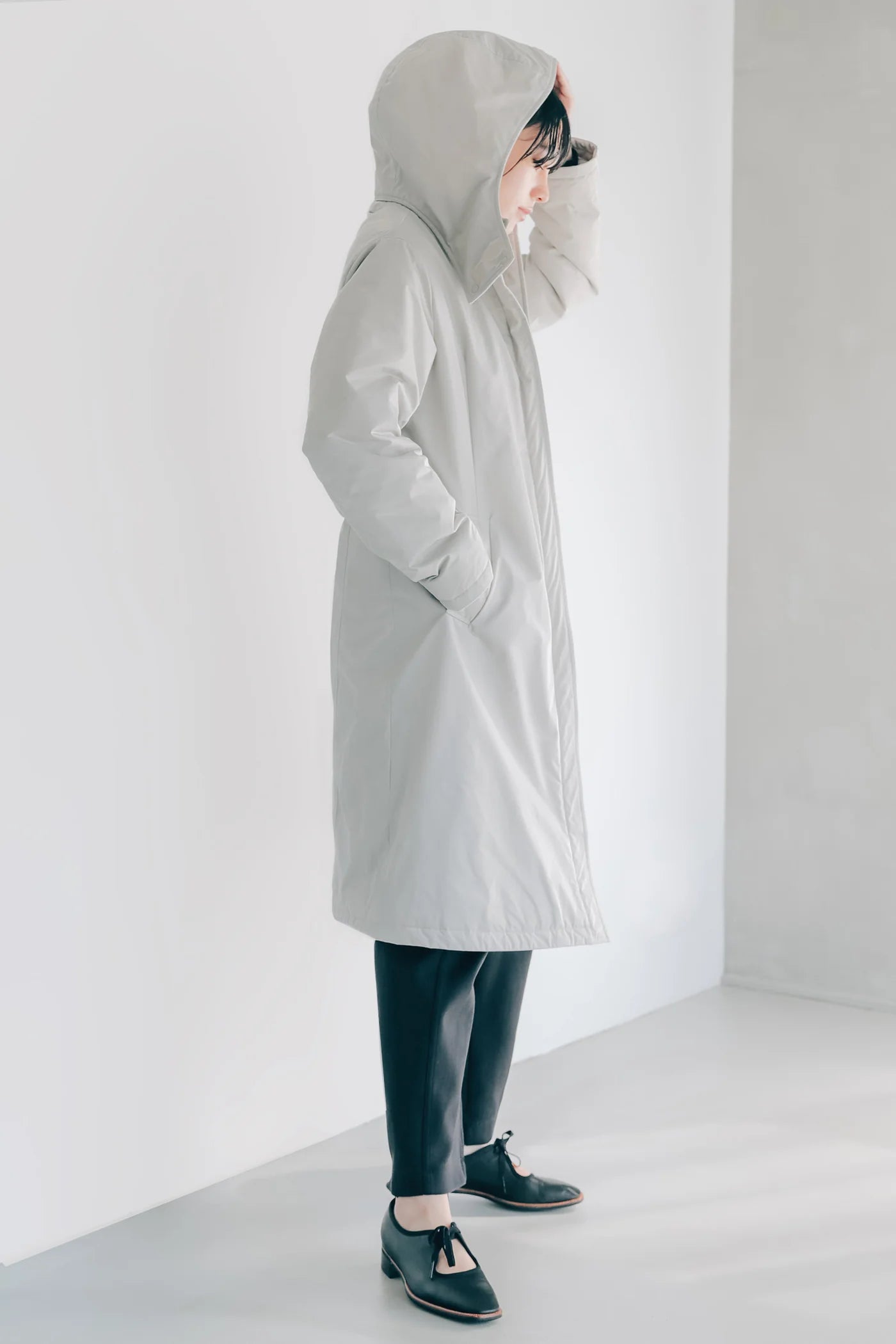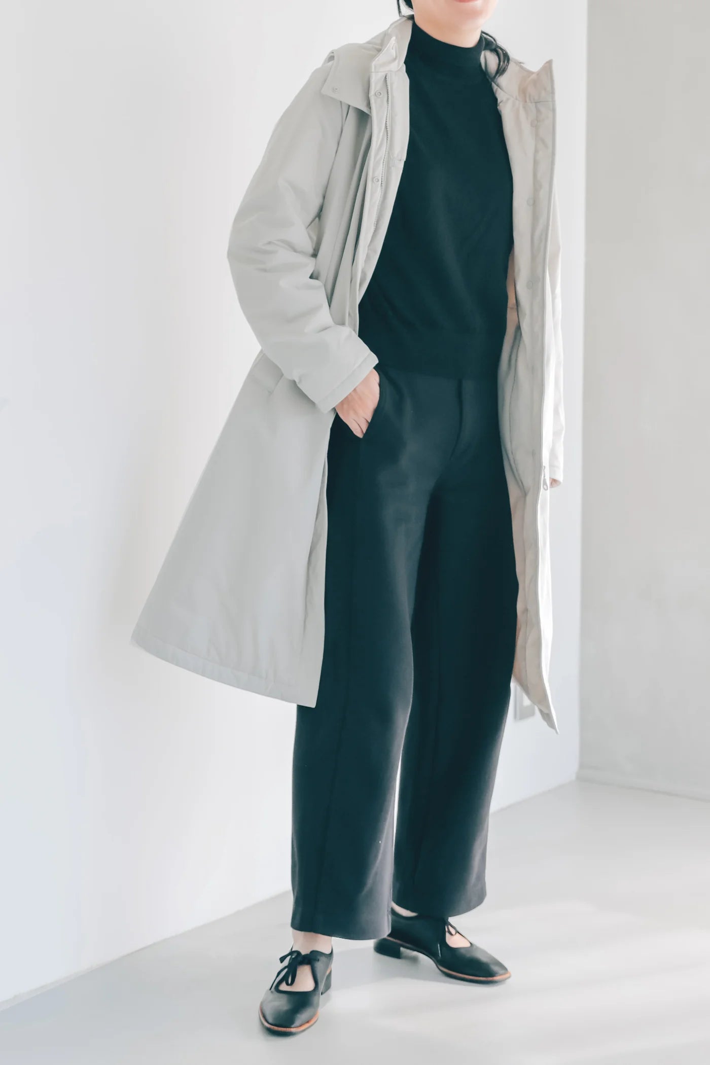 カポックダウンを使用したウエストベルトが付いた細見えするシルエットのフードコート。軽量だがダウンと同じ暖かさがあり、程よい光沢感のある上品な生地なのでかっちりにもカジュアルにもなる1着。
