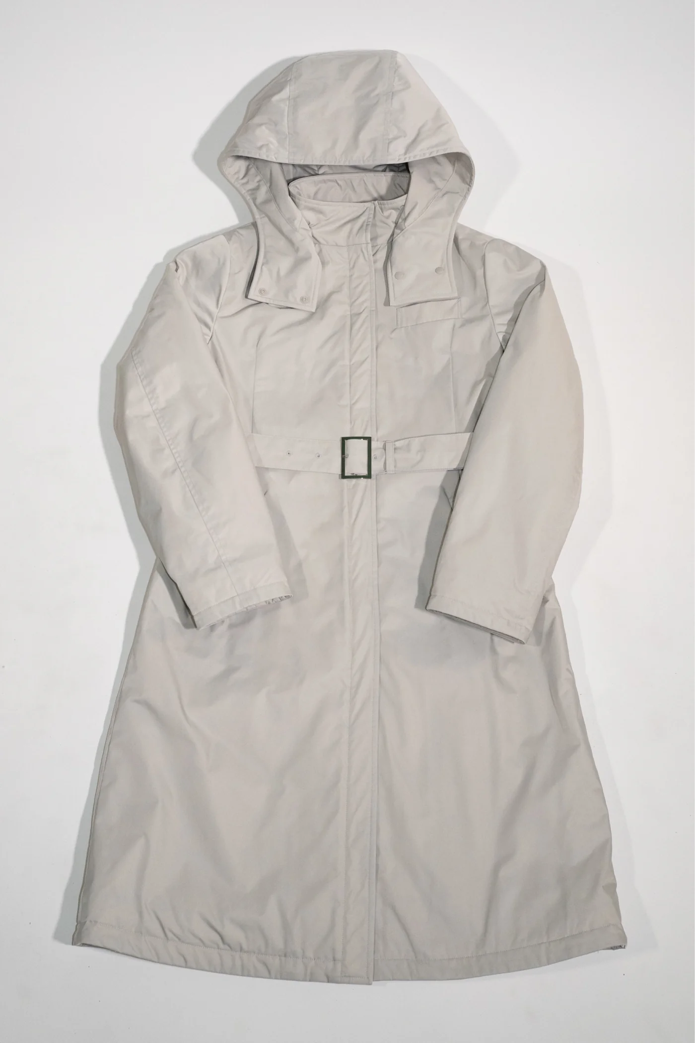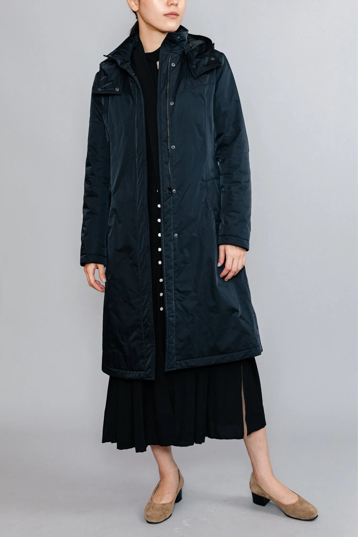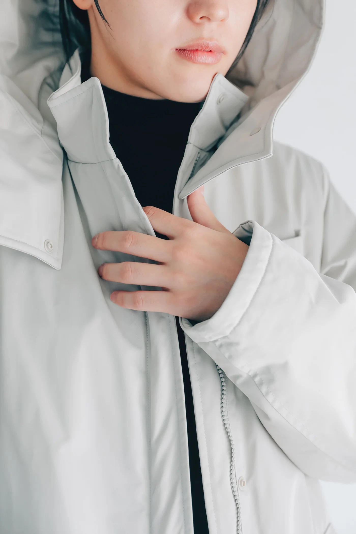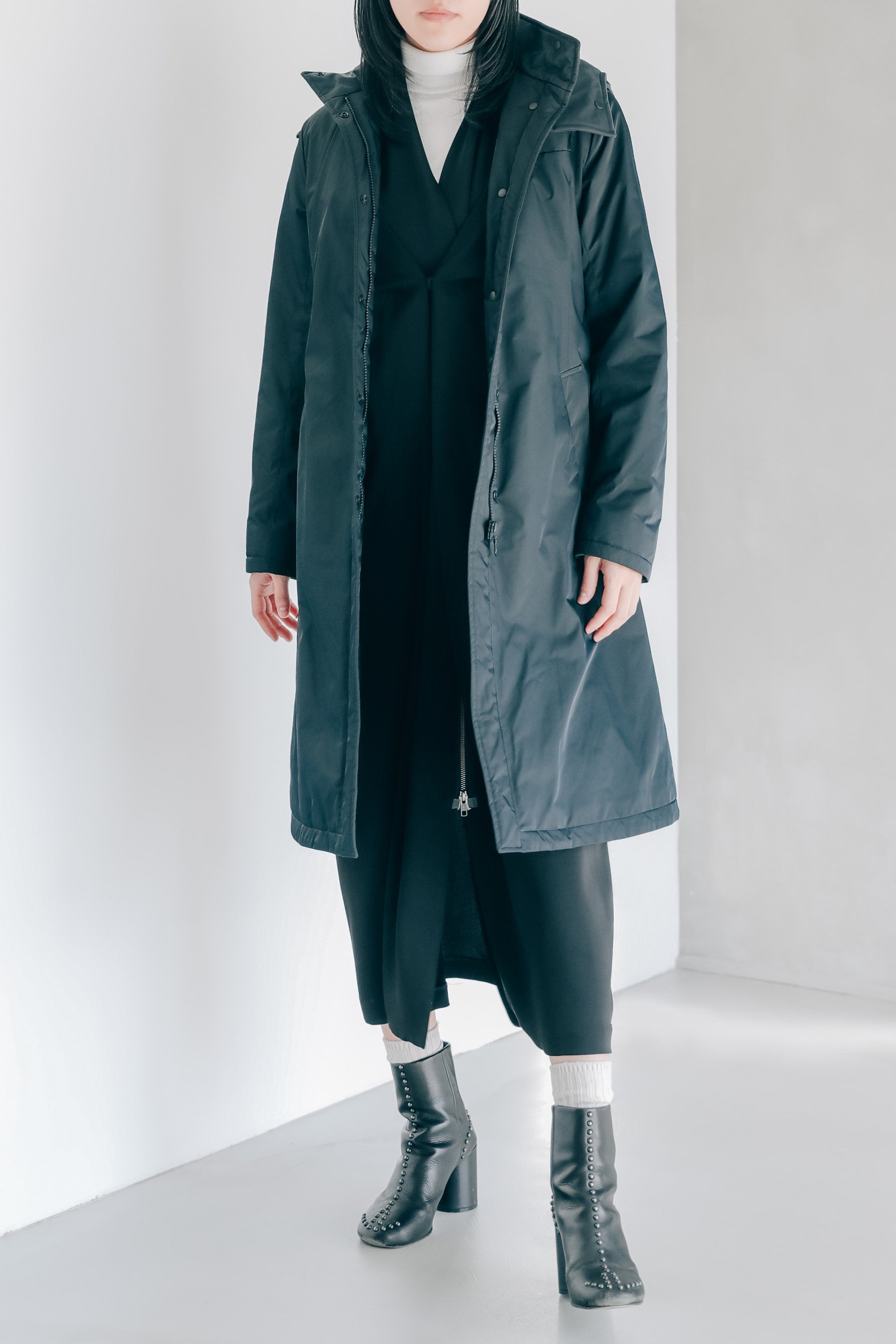 カポックダウンを使用したウエストベルトが付いた細見えするシルエットのフードコート。軽量だがダウンと同じ暖かさがあり、程よい光沢感のある上品な生地なのでかっちりにもカジュアルにもなる1着。