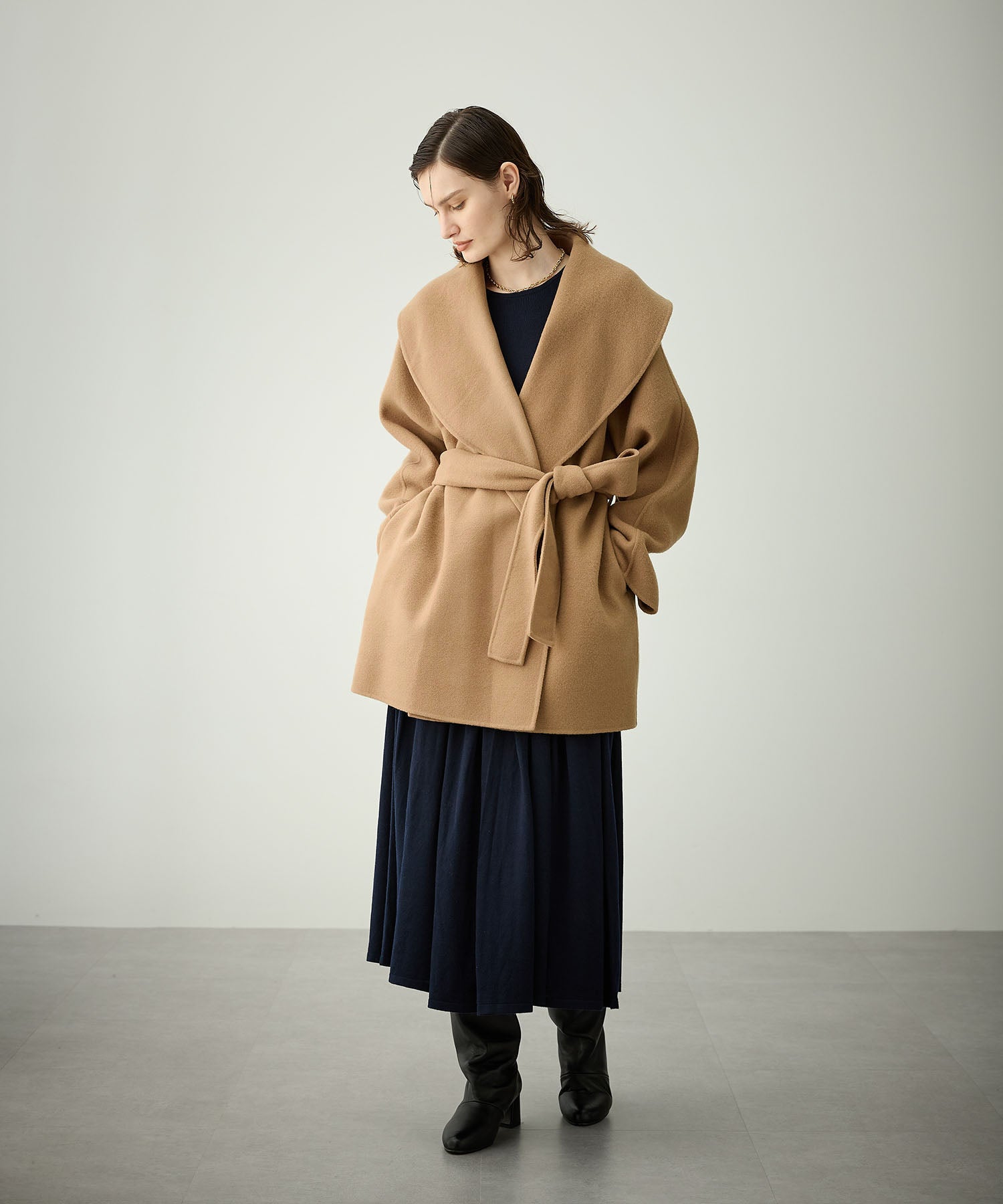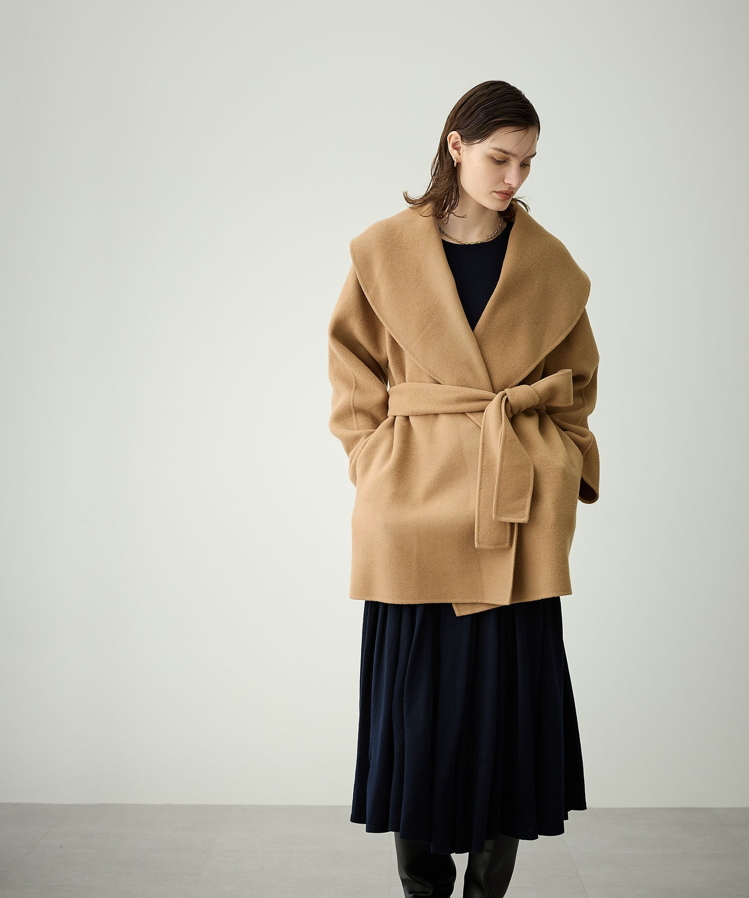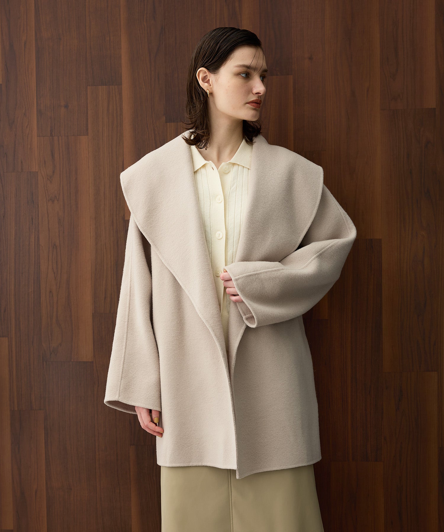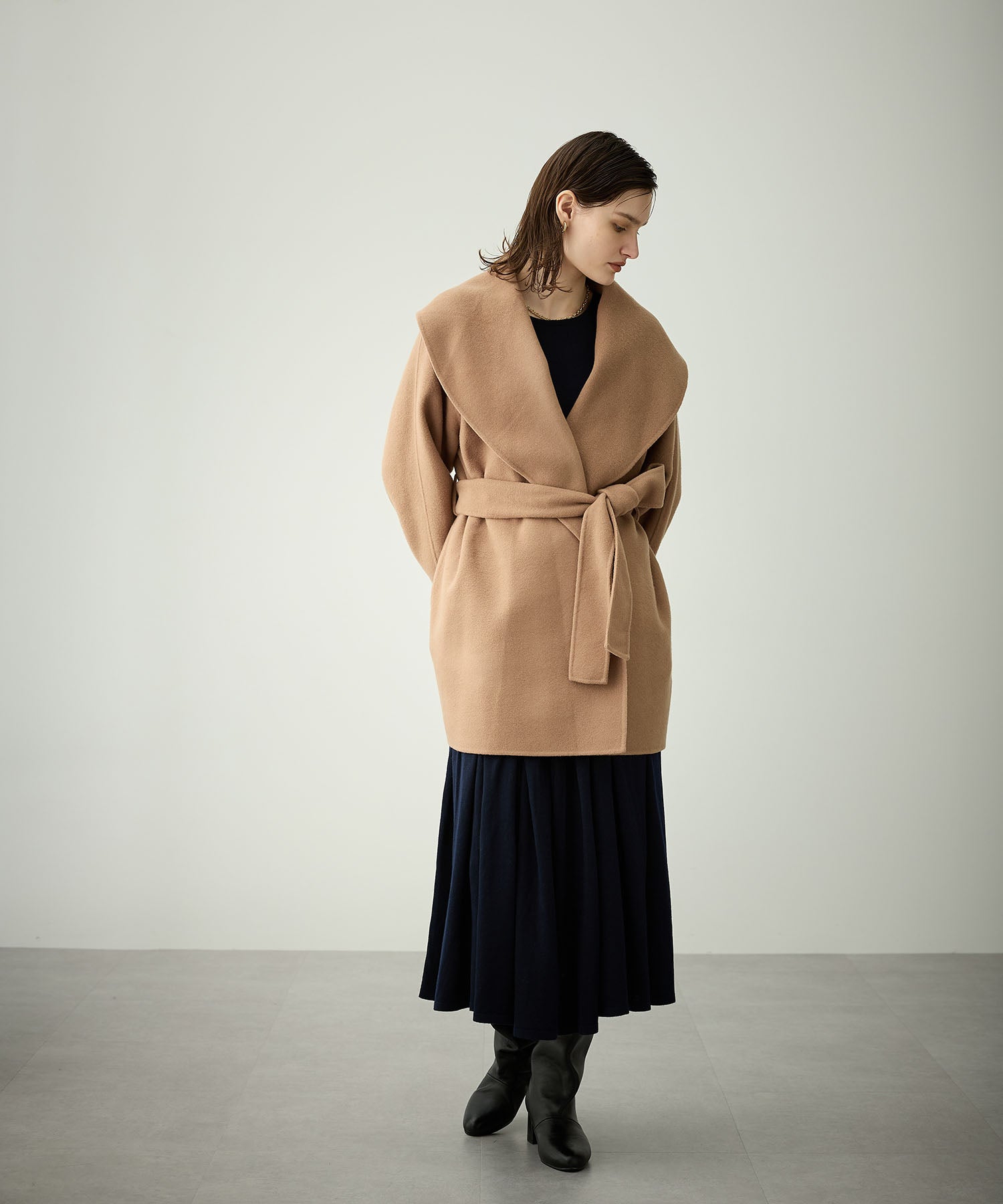 大きめのショールカラーが華やかなミドルリバーコート