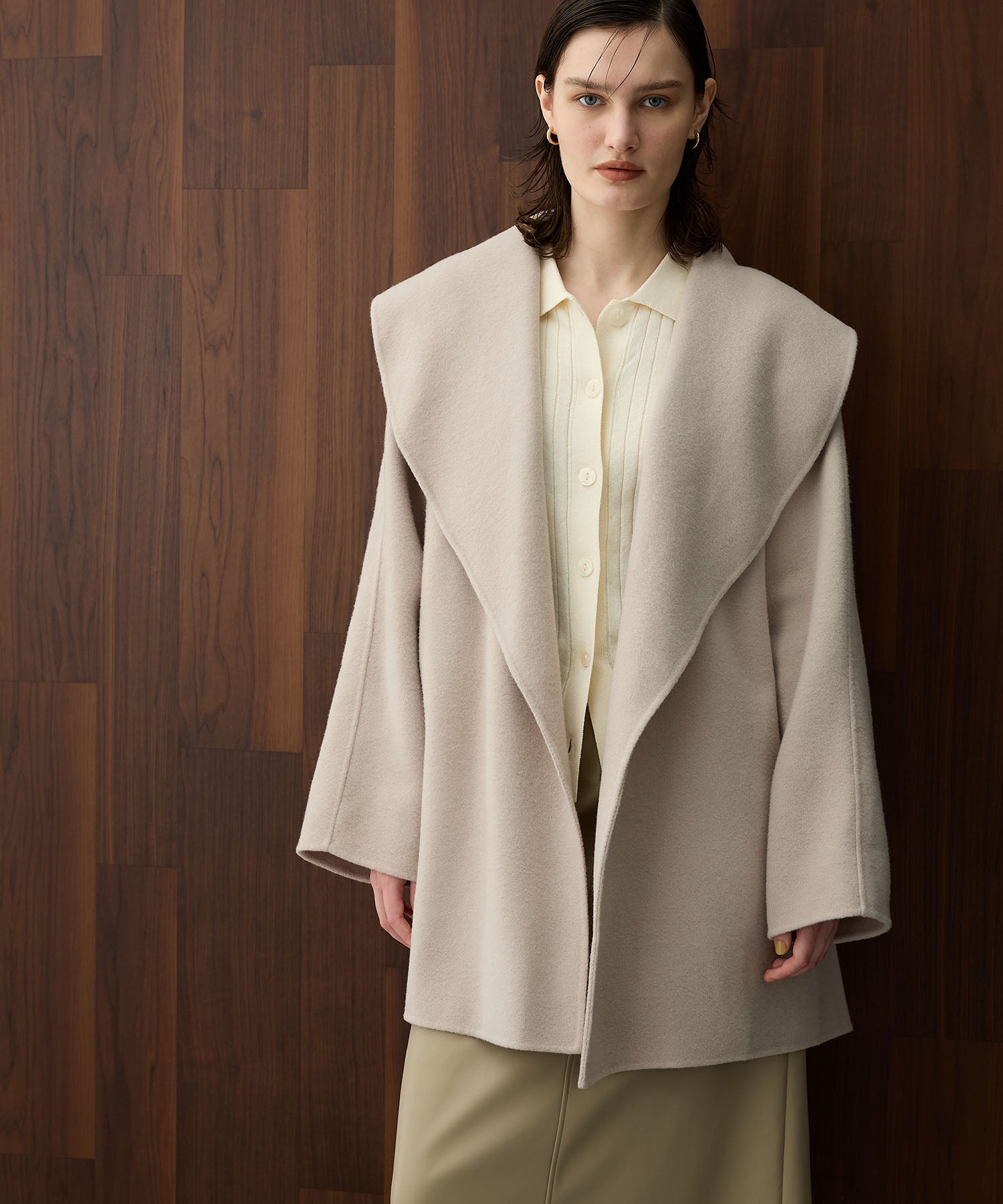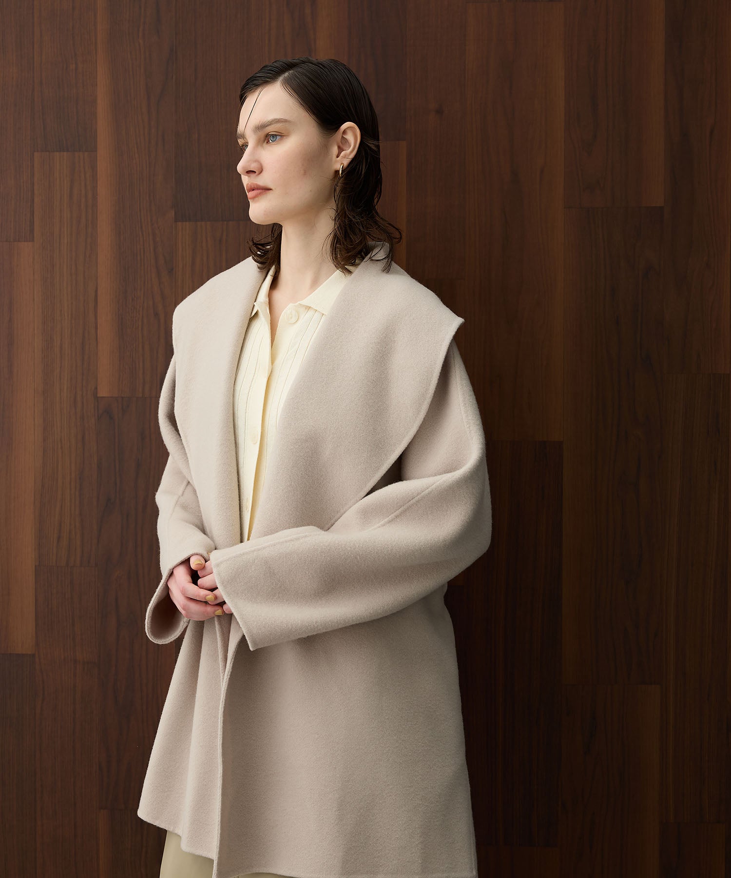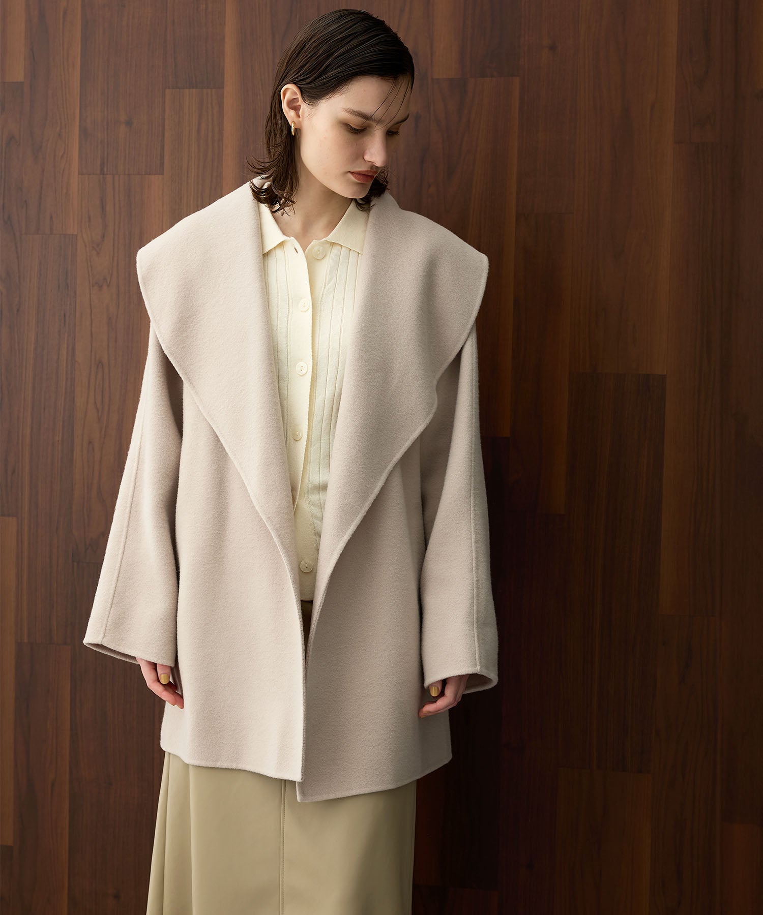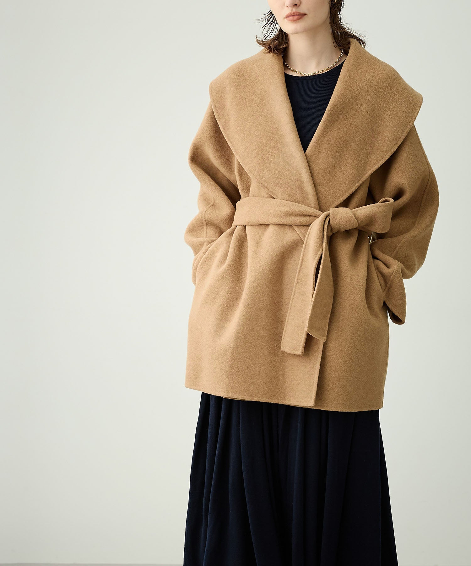 ローブ感覚でリラクシーに羽織って頂けるハーフ丈のリバーコート。