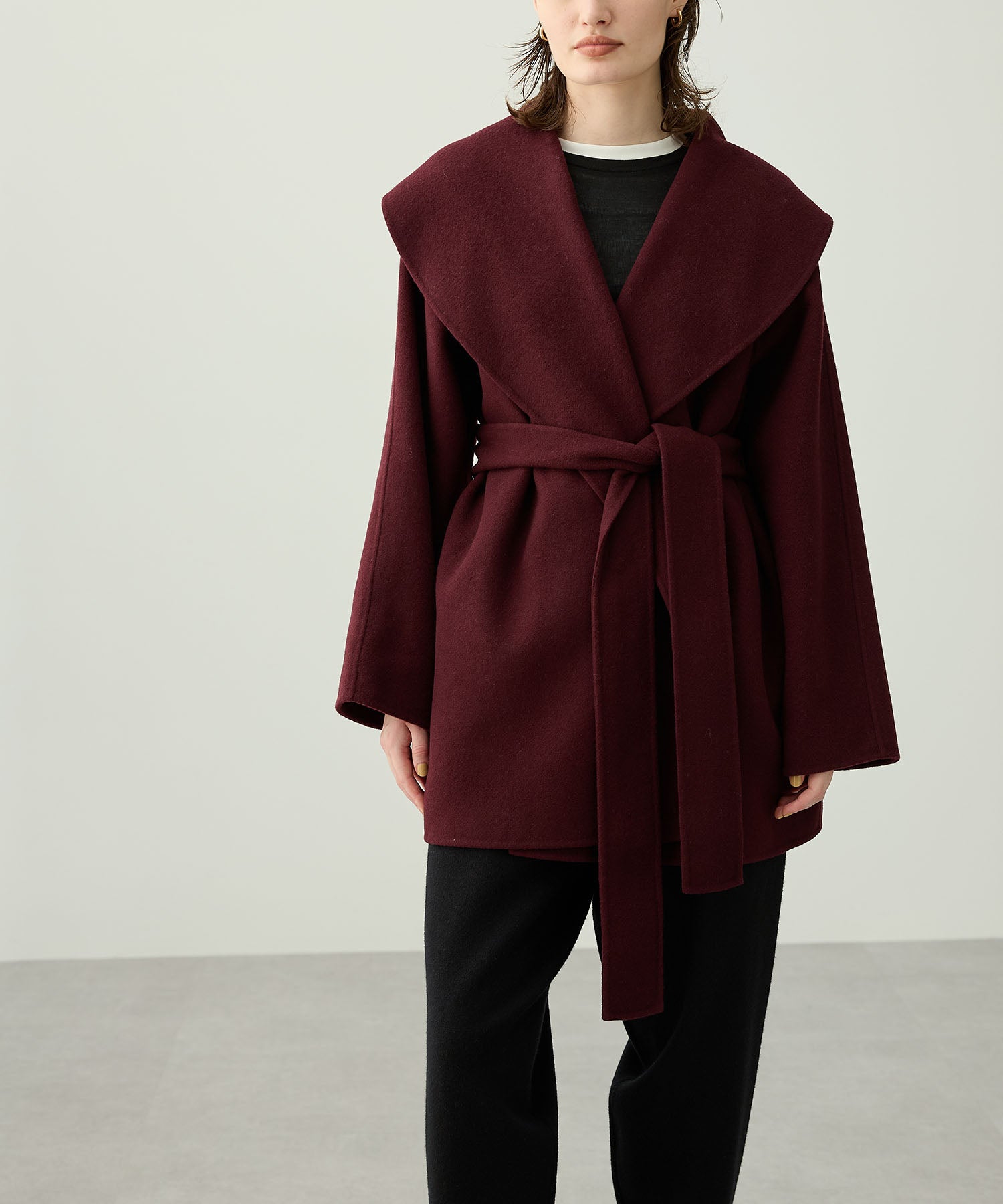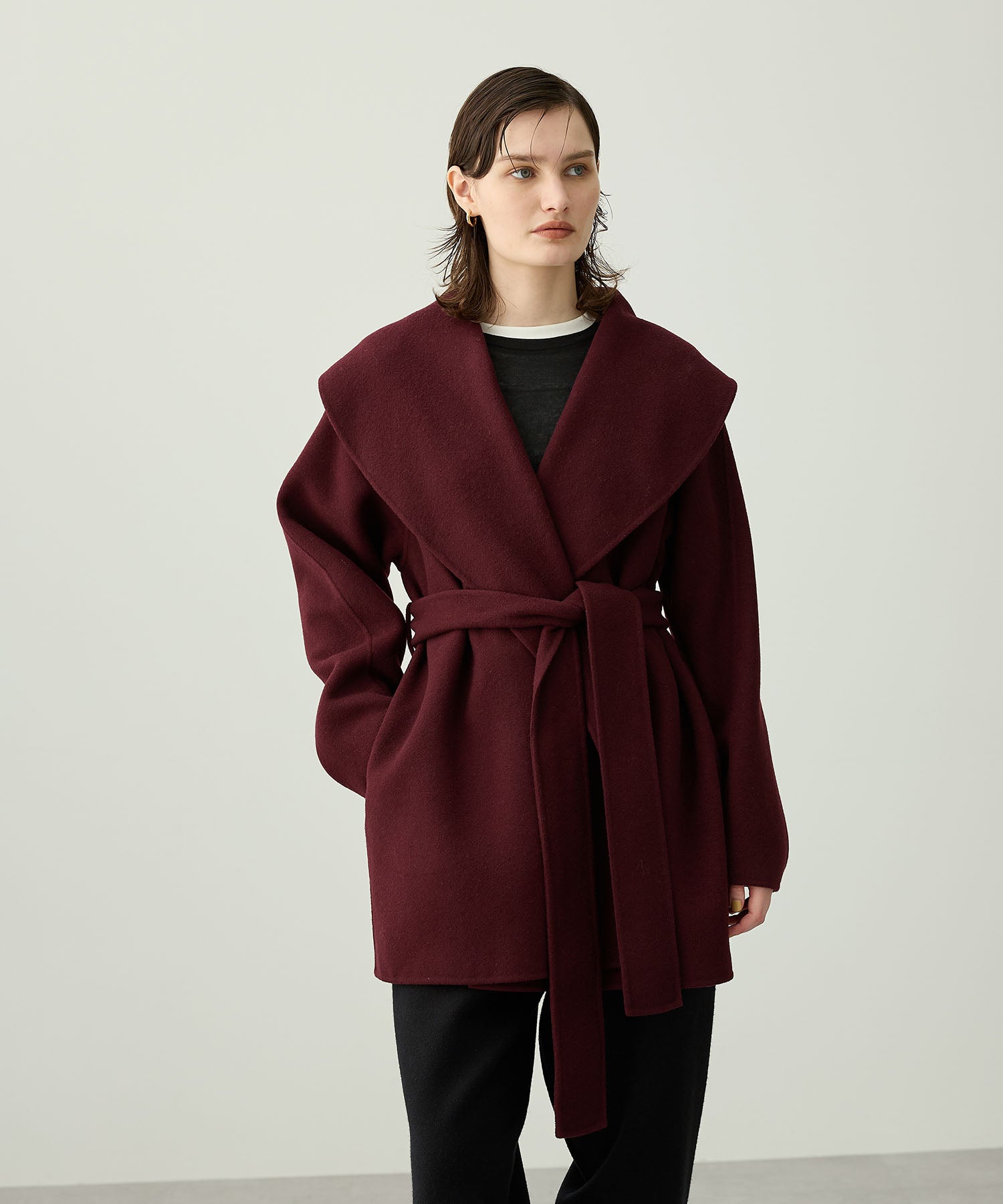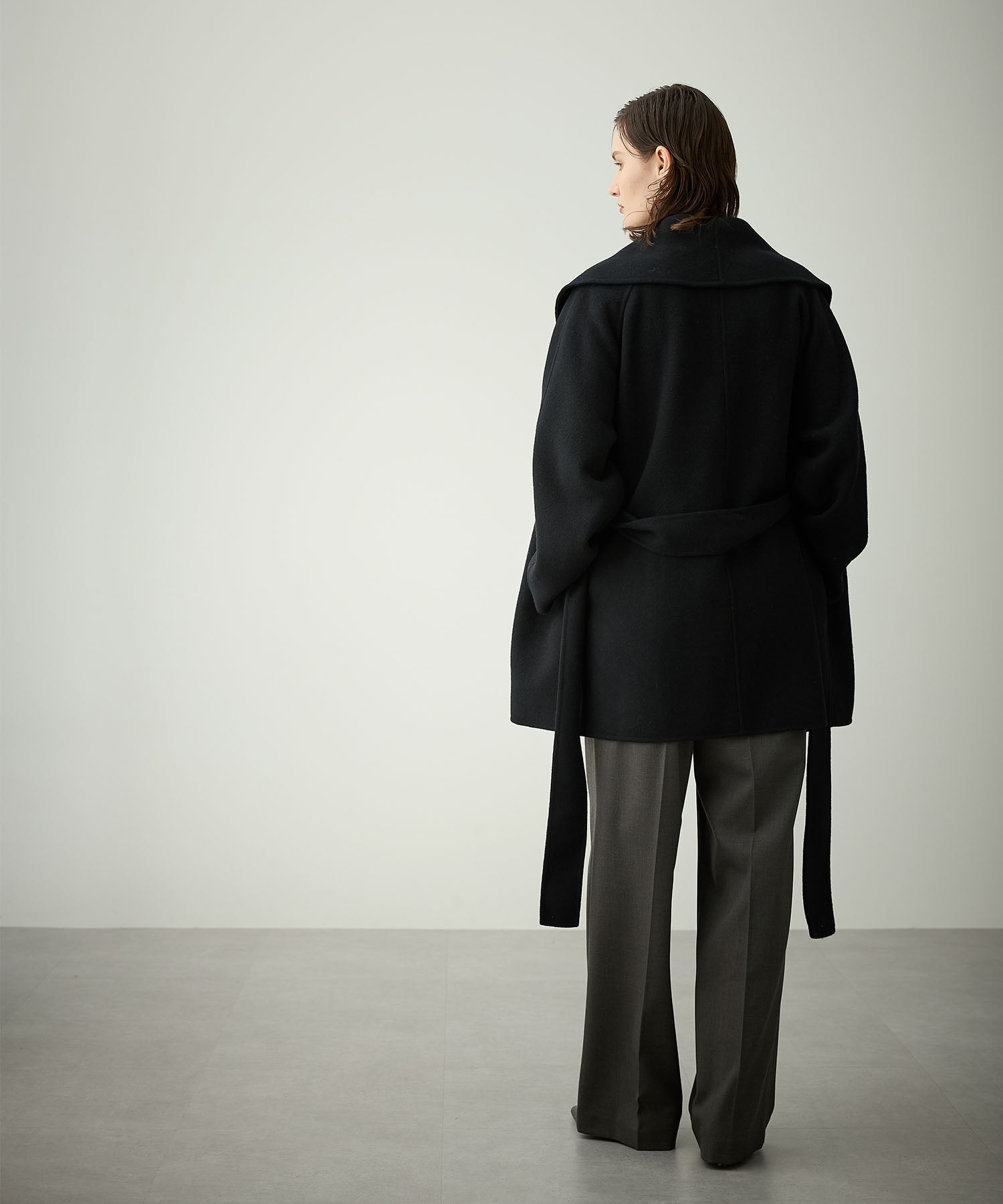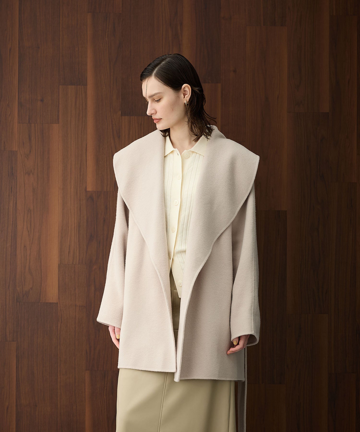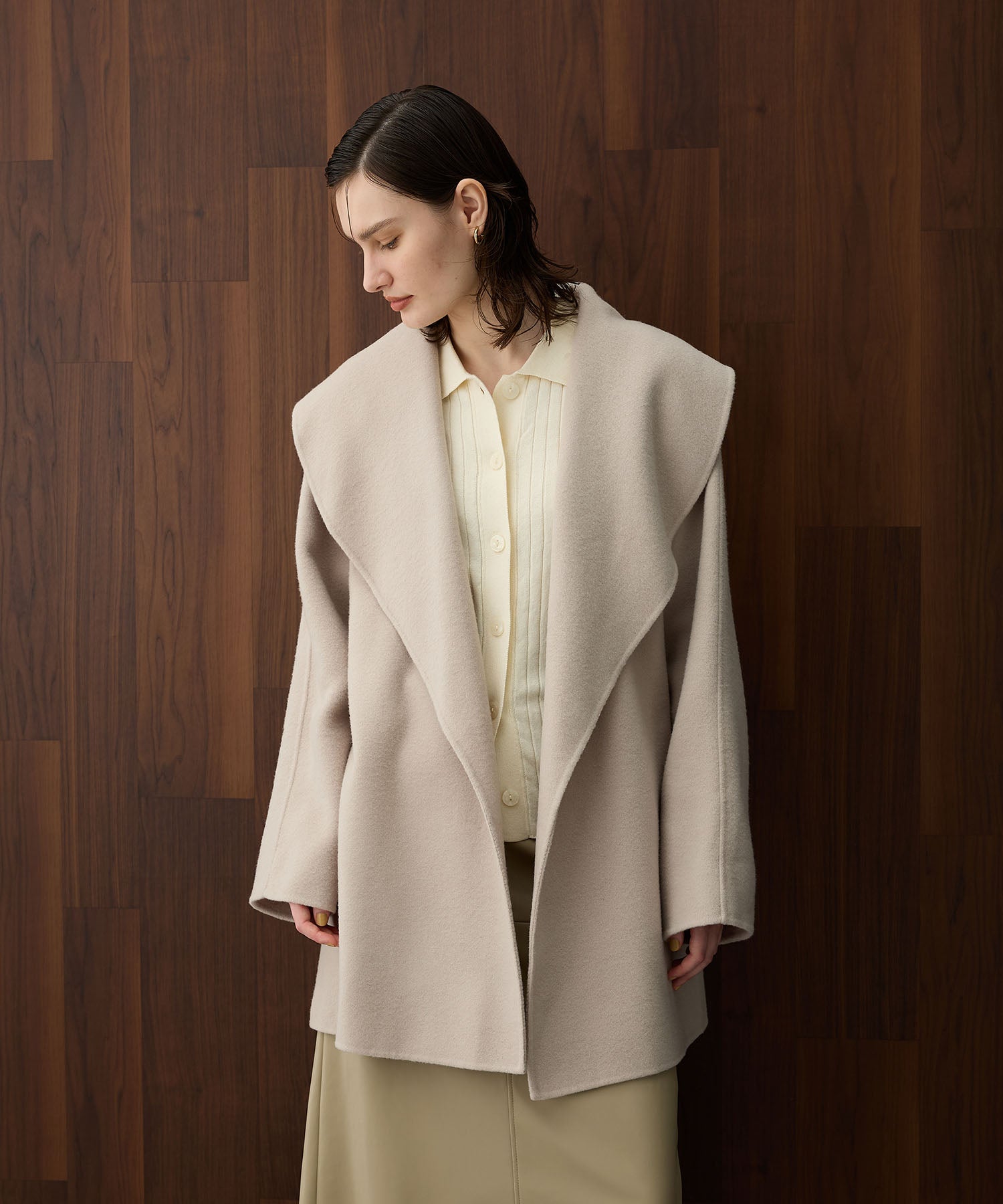 ローブ感覚でリラクシーに羽織って頂けるハーフ丈のリバーコート。
