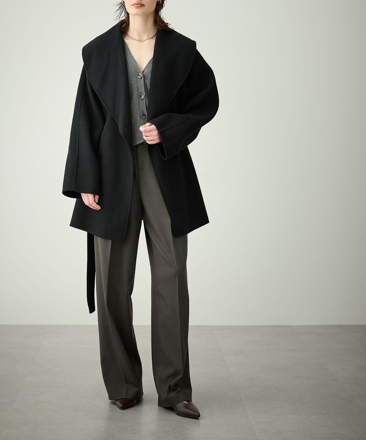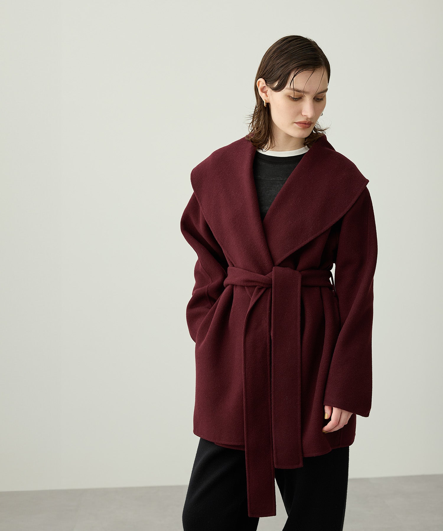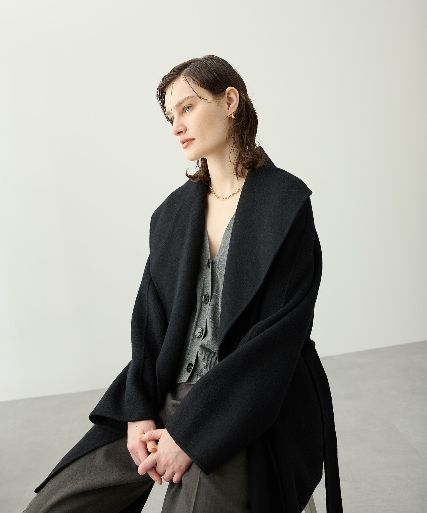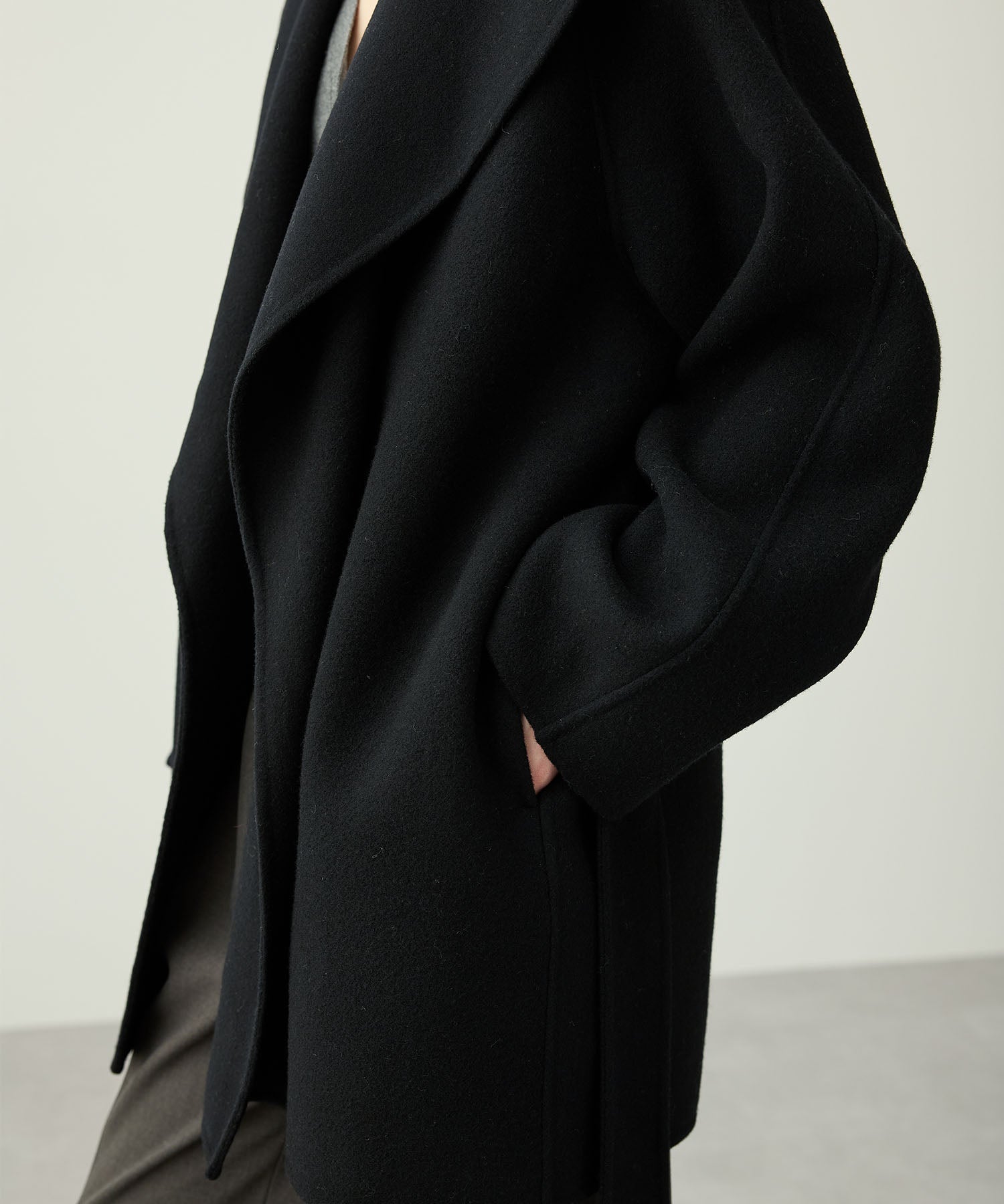 ローブ感覚でリラクシーに羽織って頂けるハーフ丈のリバーコート。