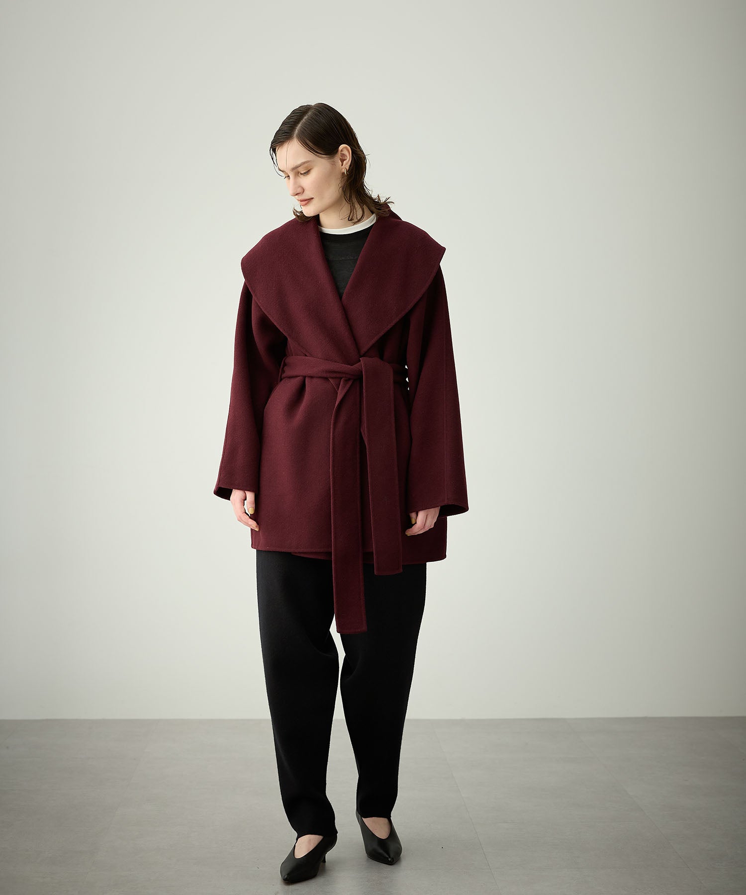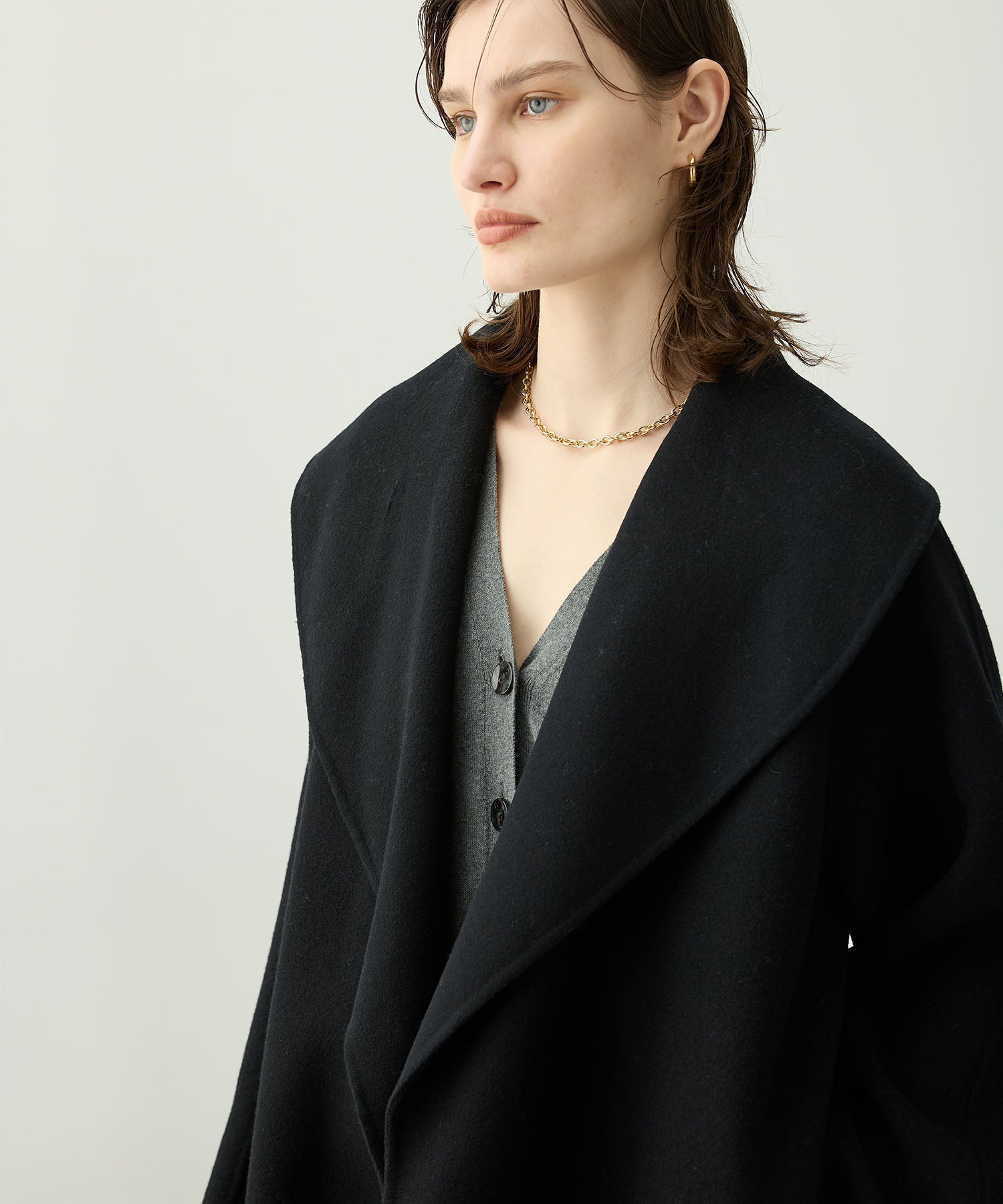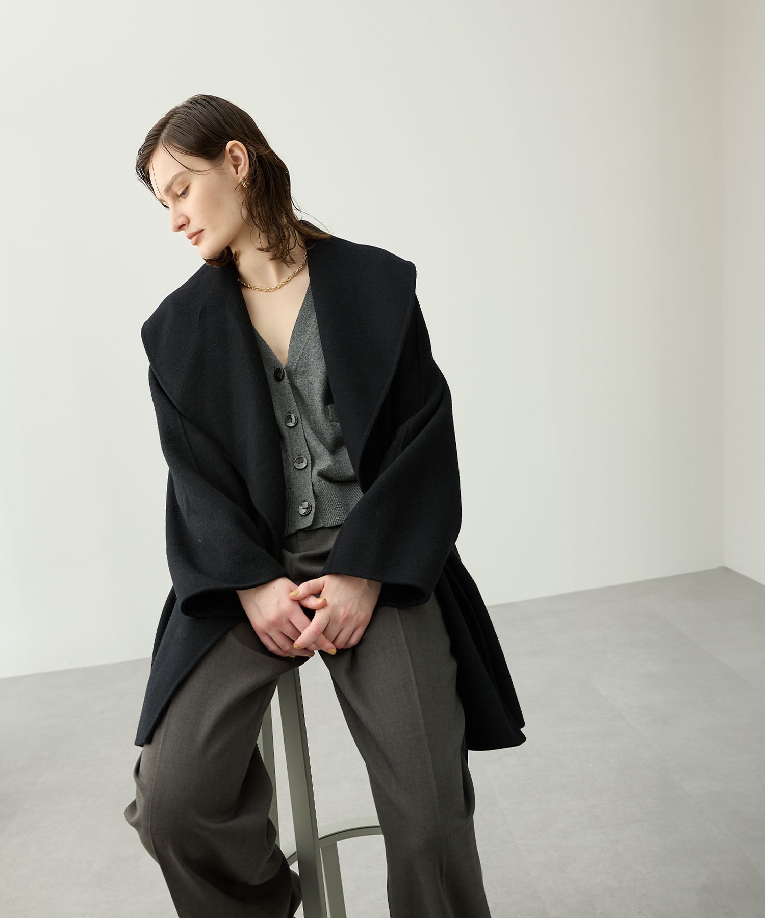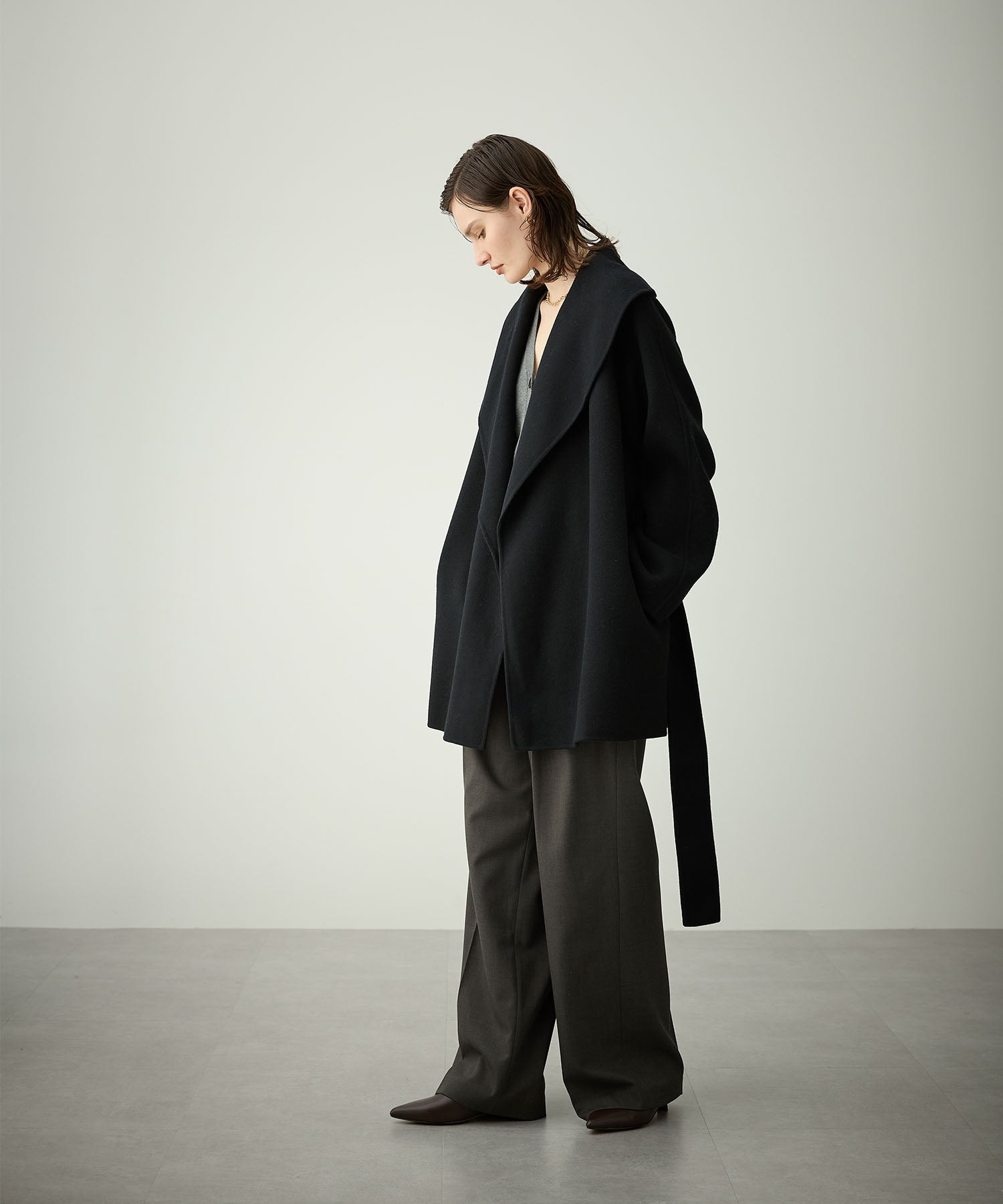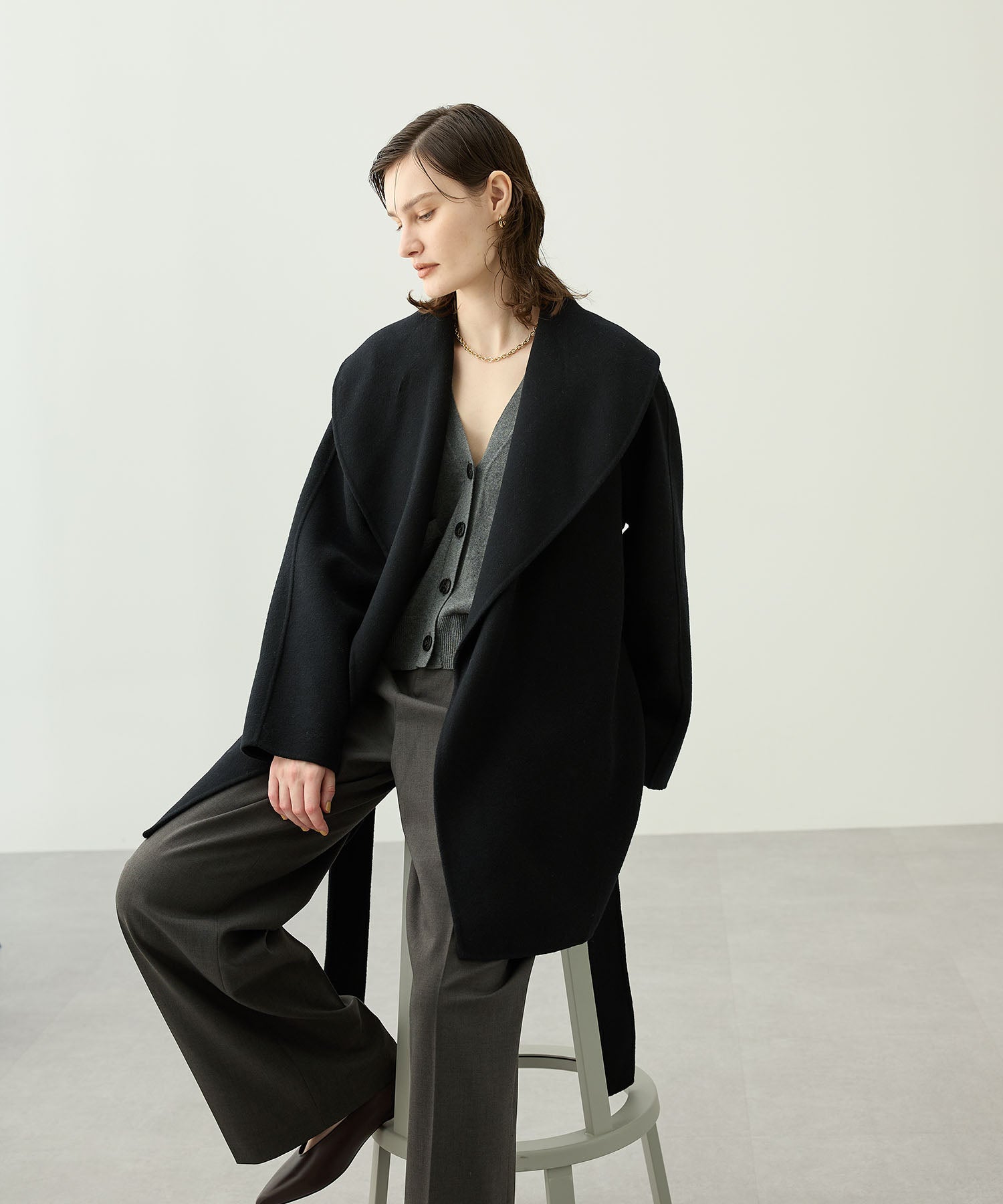 ローブ感覚でリラクシーに羽織って頂けるハーフ丈のリバーコート。