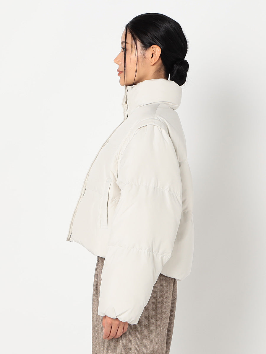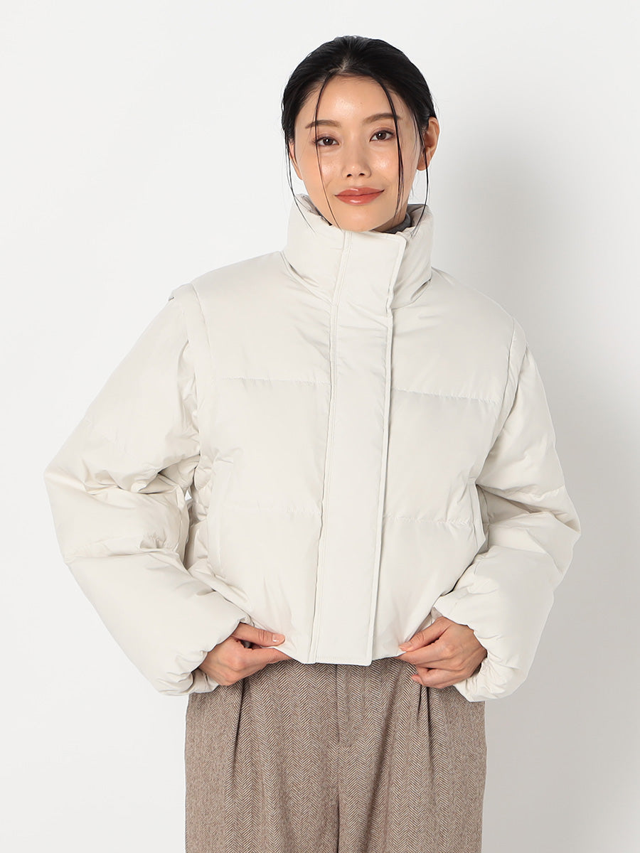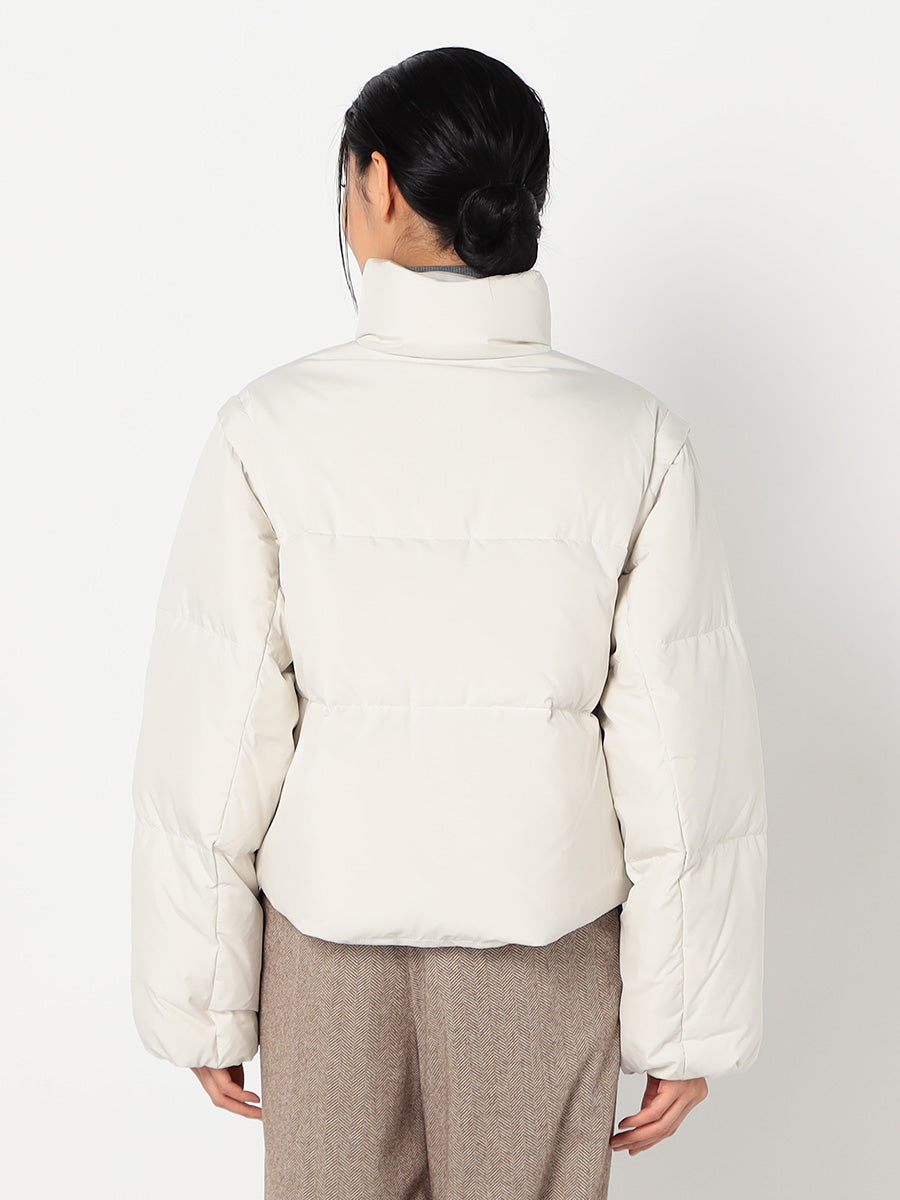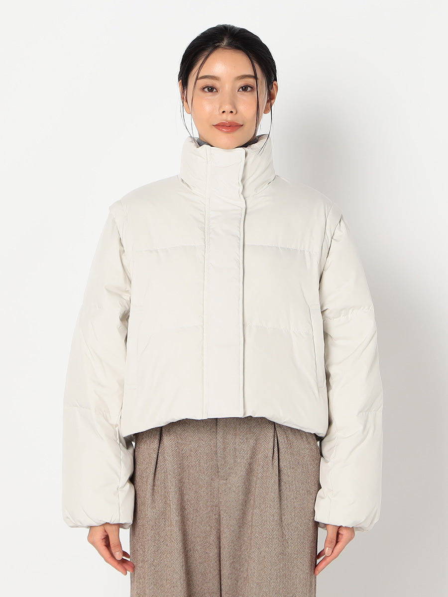 アームホールのファスナーで袖を取り外すことでベストとしても着用できる2wayデザイン。軽くて暖かいショートダウンは、適度なボリューム感がありつつも着ぶくれしないシルエットにする為に、ダウンの分量をパーツによって変えているのも拘りポイント。裾はドローコード付きなので、絞ってフォルム感を出しても着ていただけます。ショート丈なので、ワンピースやボリュームスカートと合わせるとスタイルアップを狙えます。