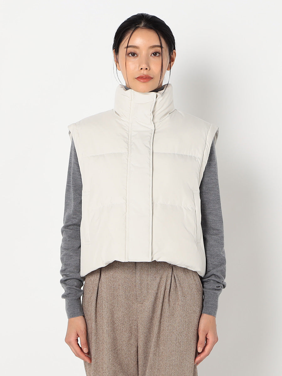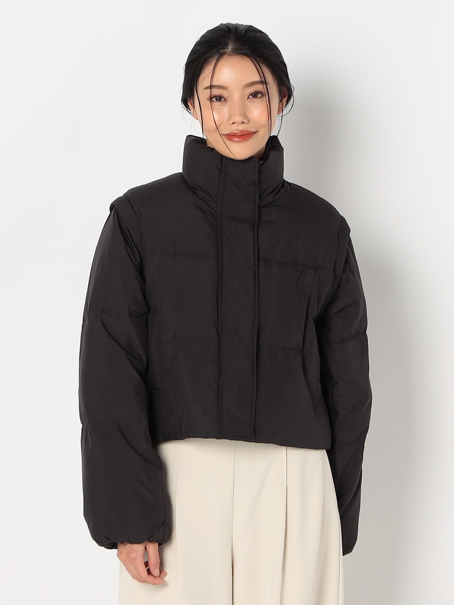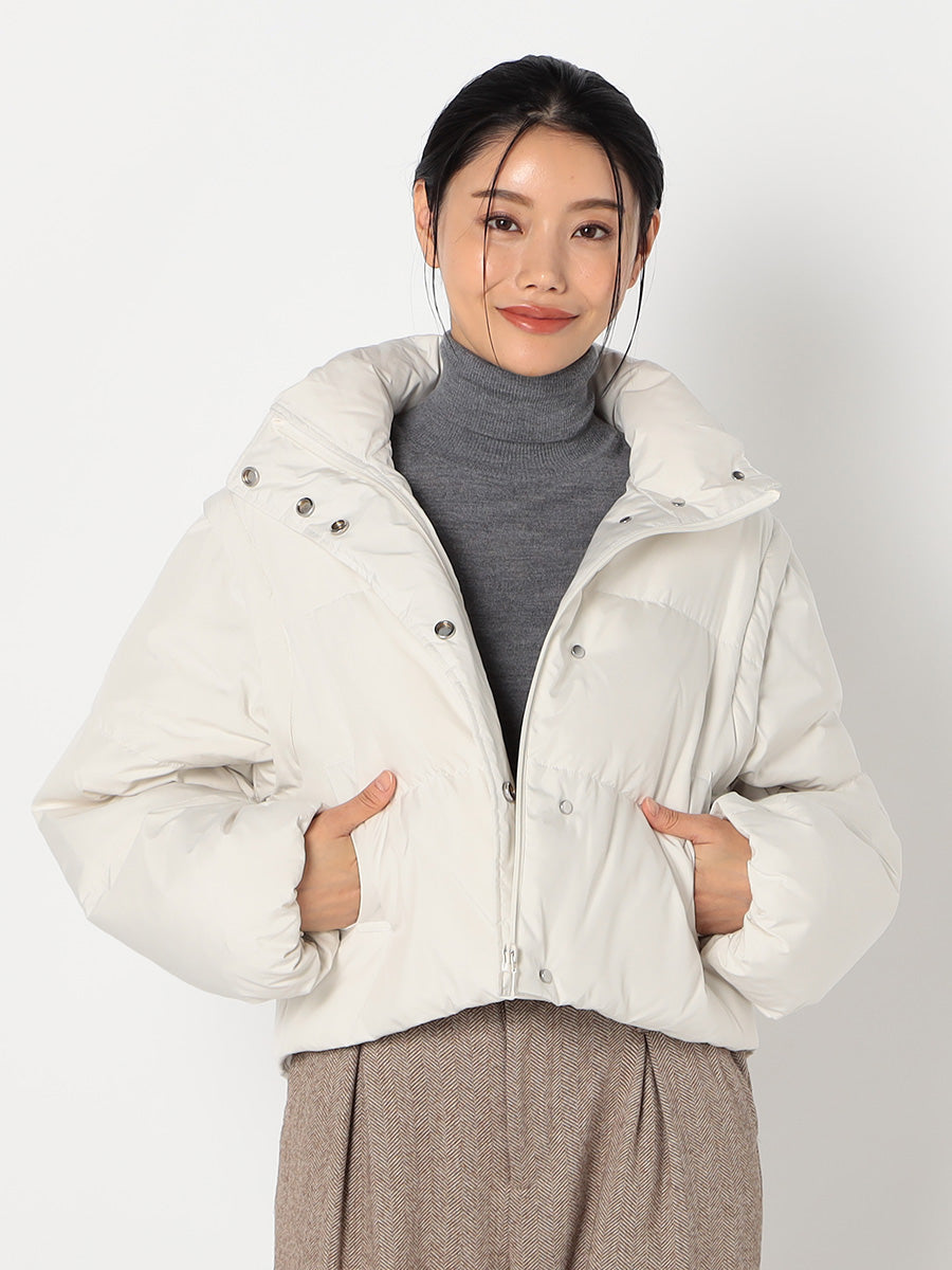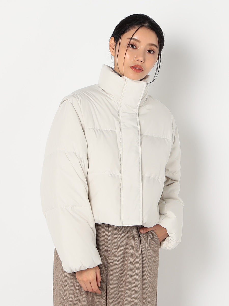 アームホールのファスナーで袖を取り外すことでベストとしても着用できる2wayデザイン。軽くて暖かいショートダウンは、適度なボリューム感がありつつも着ぶくれしないシルエットにする為に、ダウンの分量をパーツによって変えているのも拘りポイント。裾はドローコード付きなので、絞ってフォルム感を出しても着ていただけます。ショート丈なので、ワンピースやボリュームスカートと合わせるとスタイルアップを狙えます。