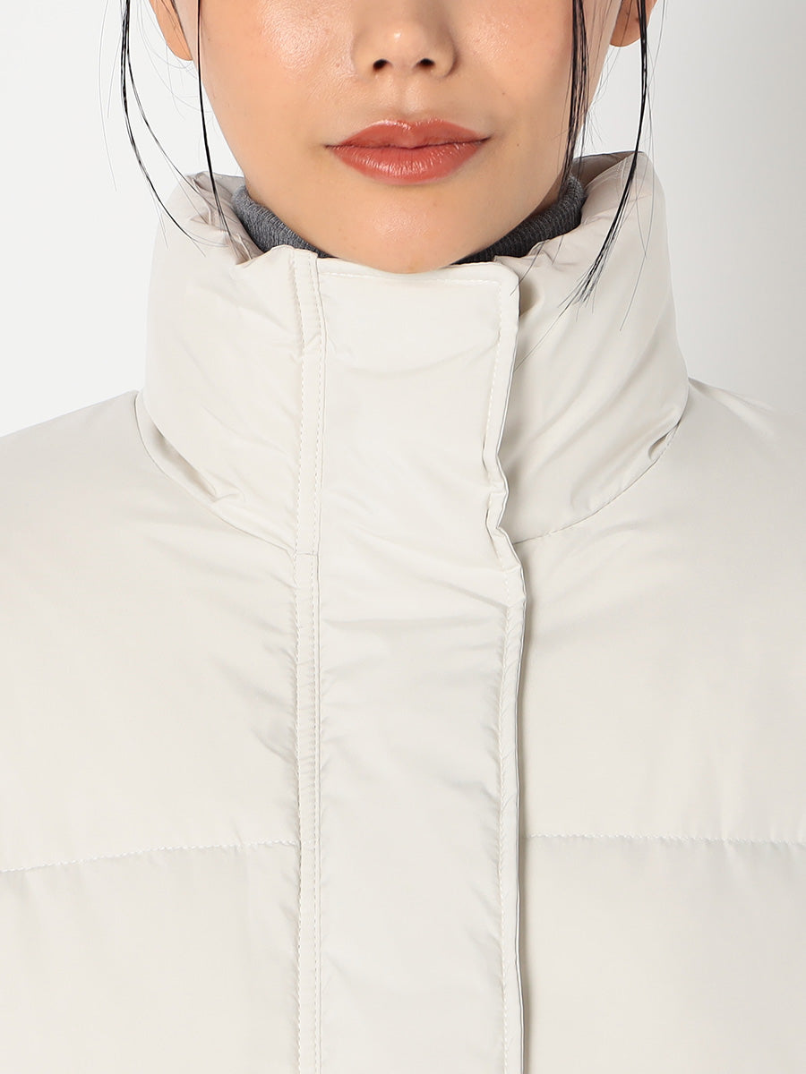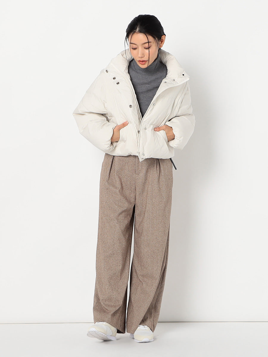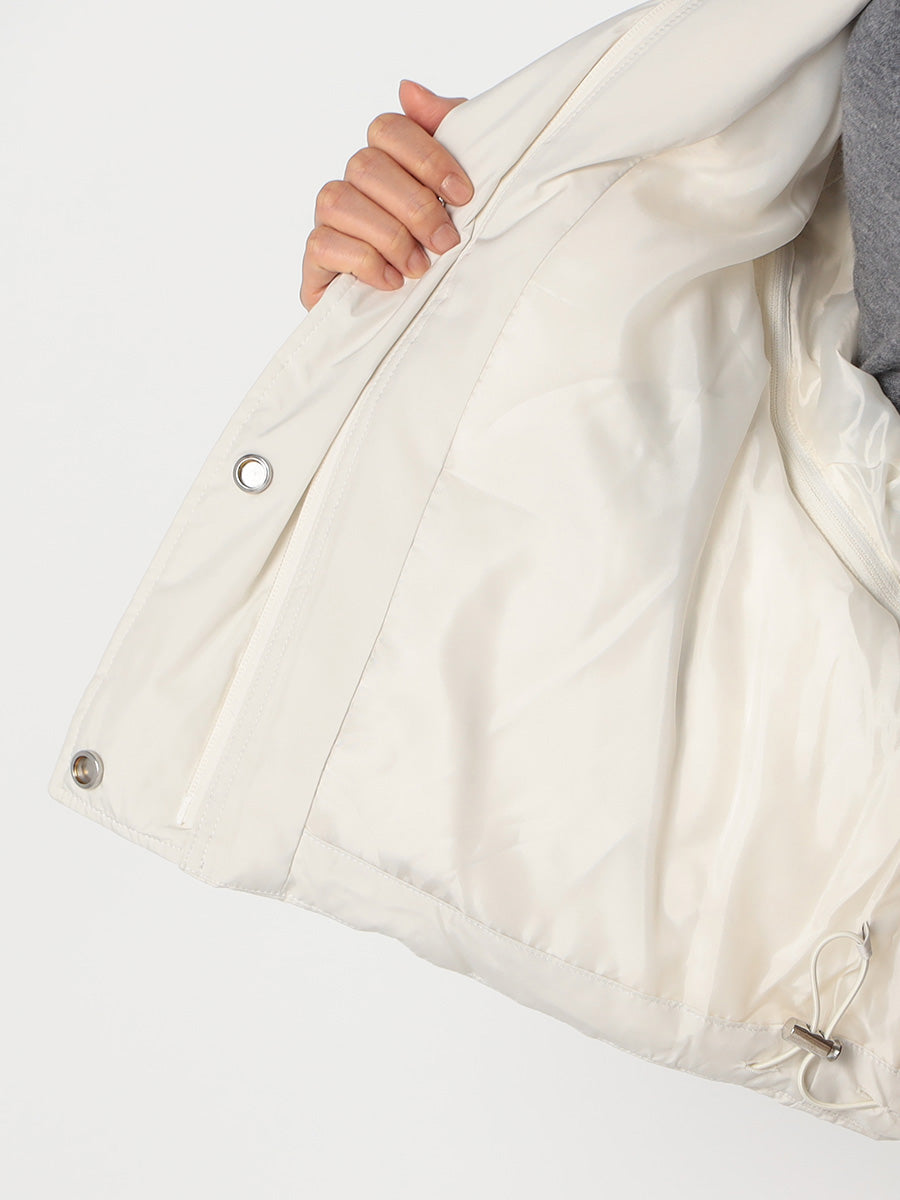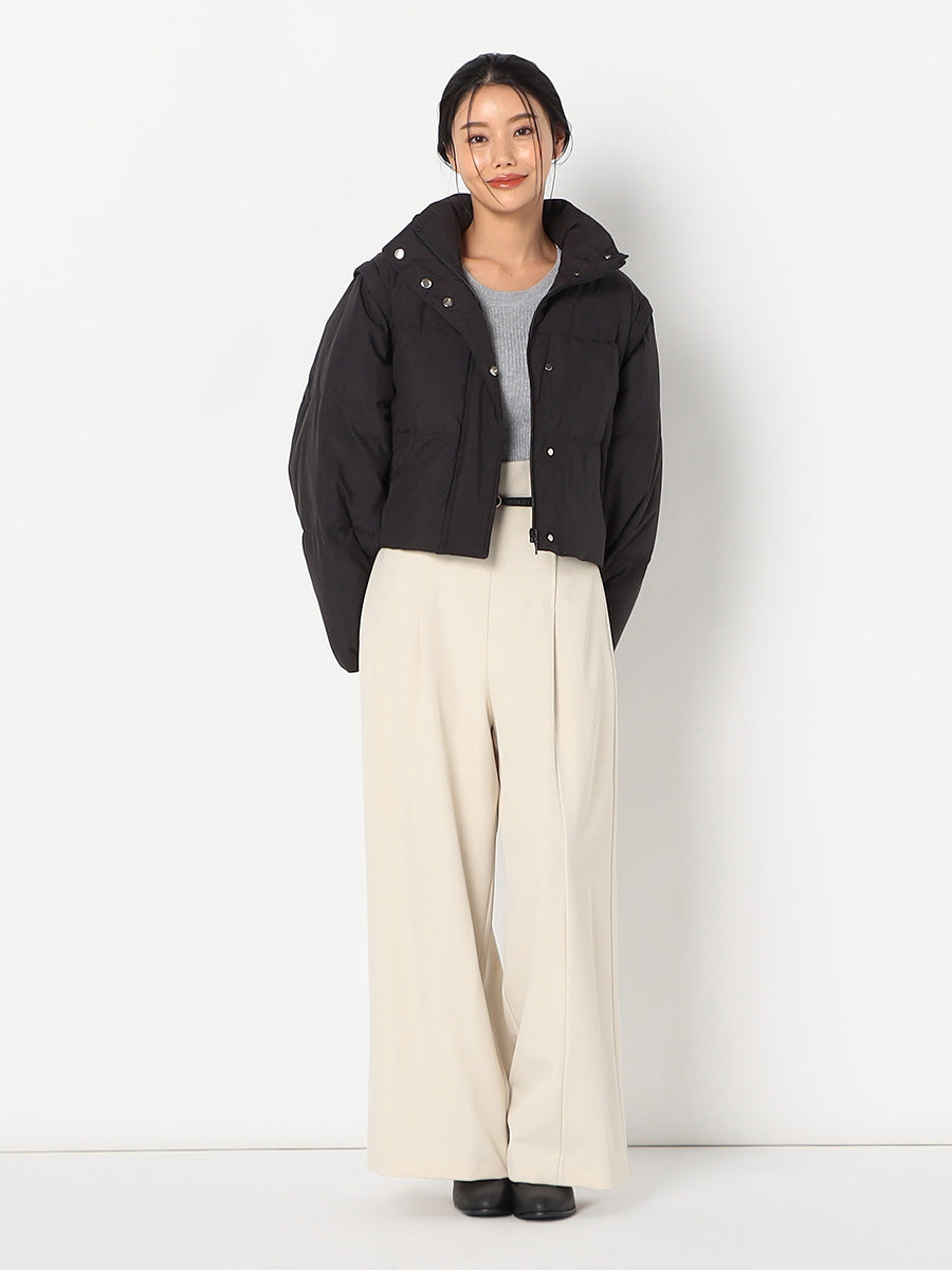 アームホールのファスナーで袖を取り外すことでベストとしても着用できる2wayデザイン。軽くて暖かいショートダウンは、適度なボリューム感がありつつも着ぶくれしないシルエットにする為に、ダウンの分量をパーツによって変えているのも拘りポイント。裾はドローコード付きなので、絞ってフォルム感を出しても着ていただけます。ショート丈なので、ワンピースやボリュームスカートと合わせるとスタイルアップを狙えます。