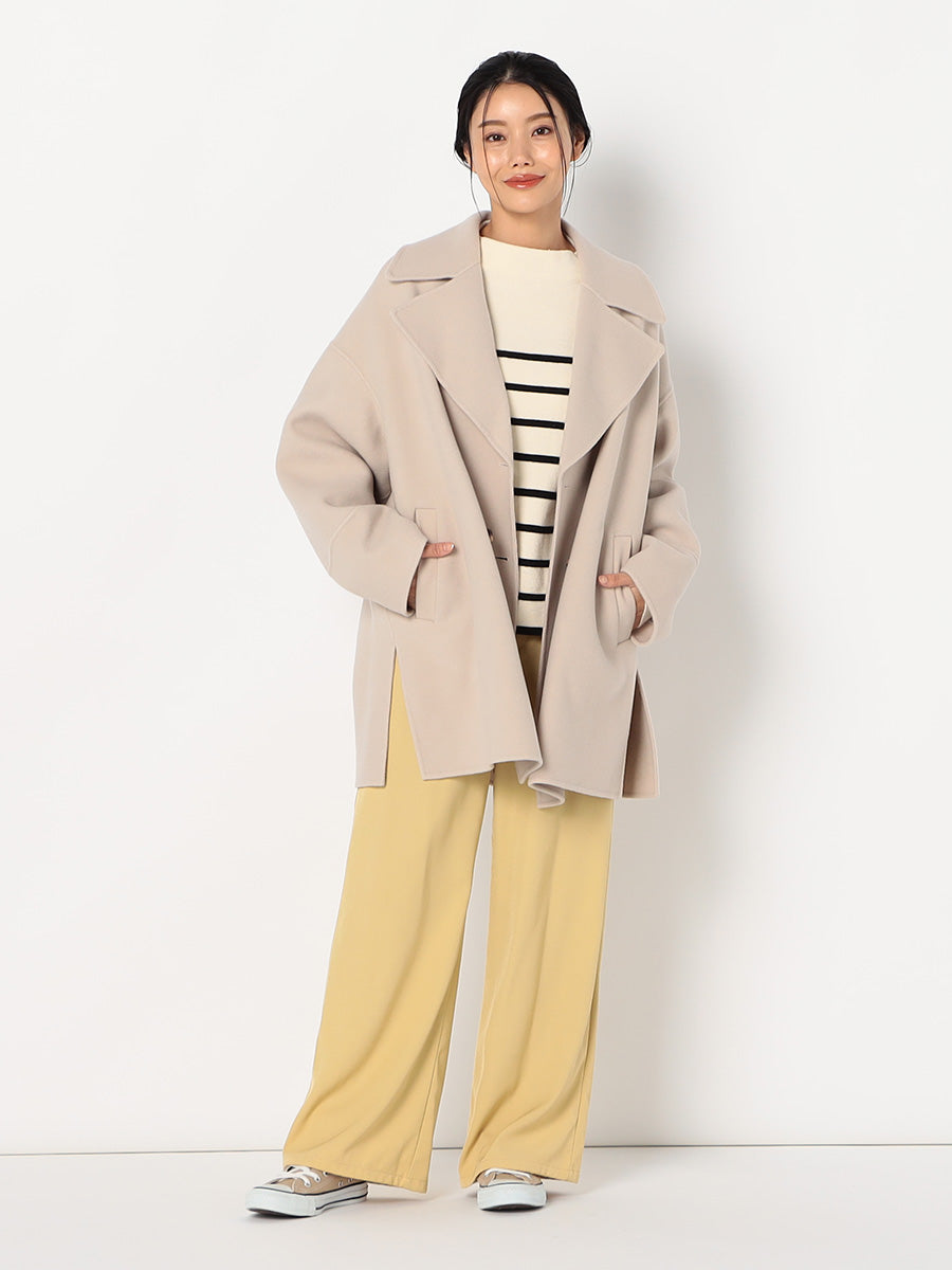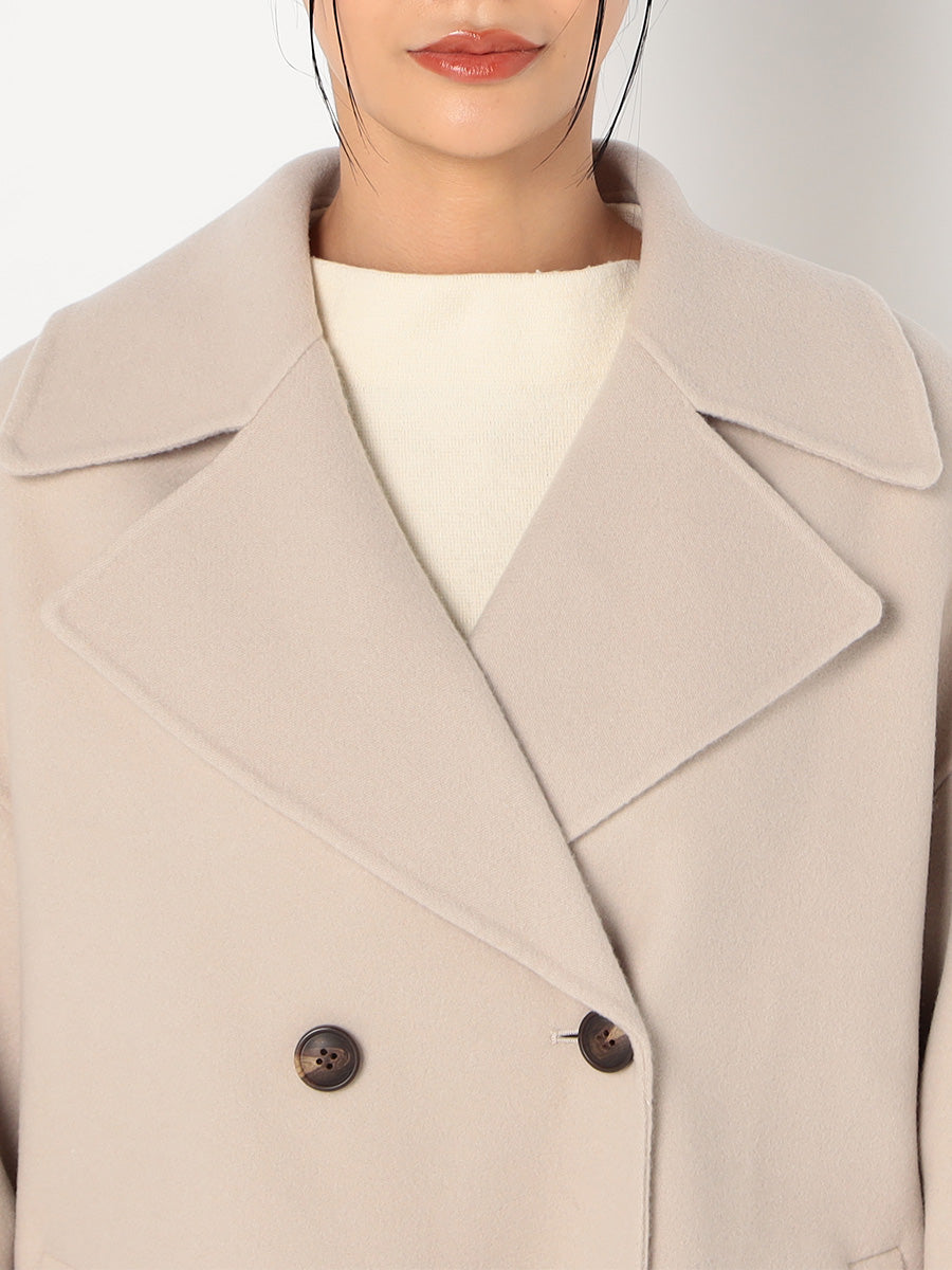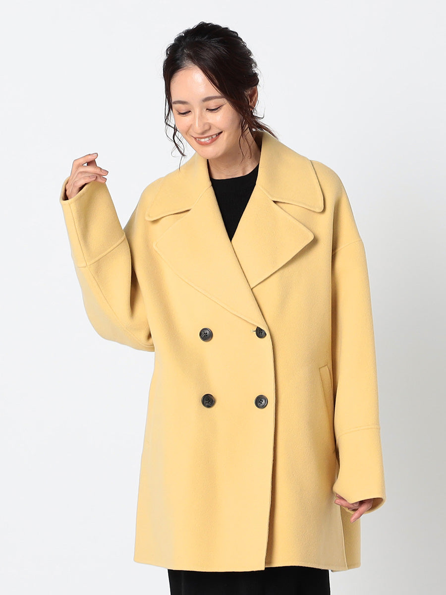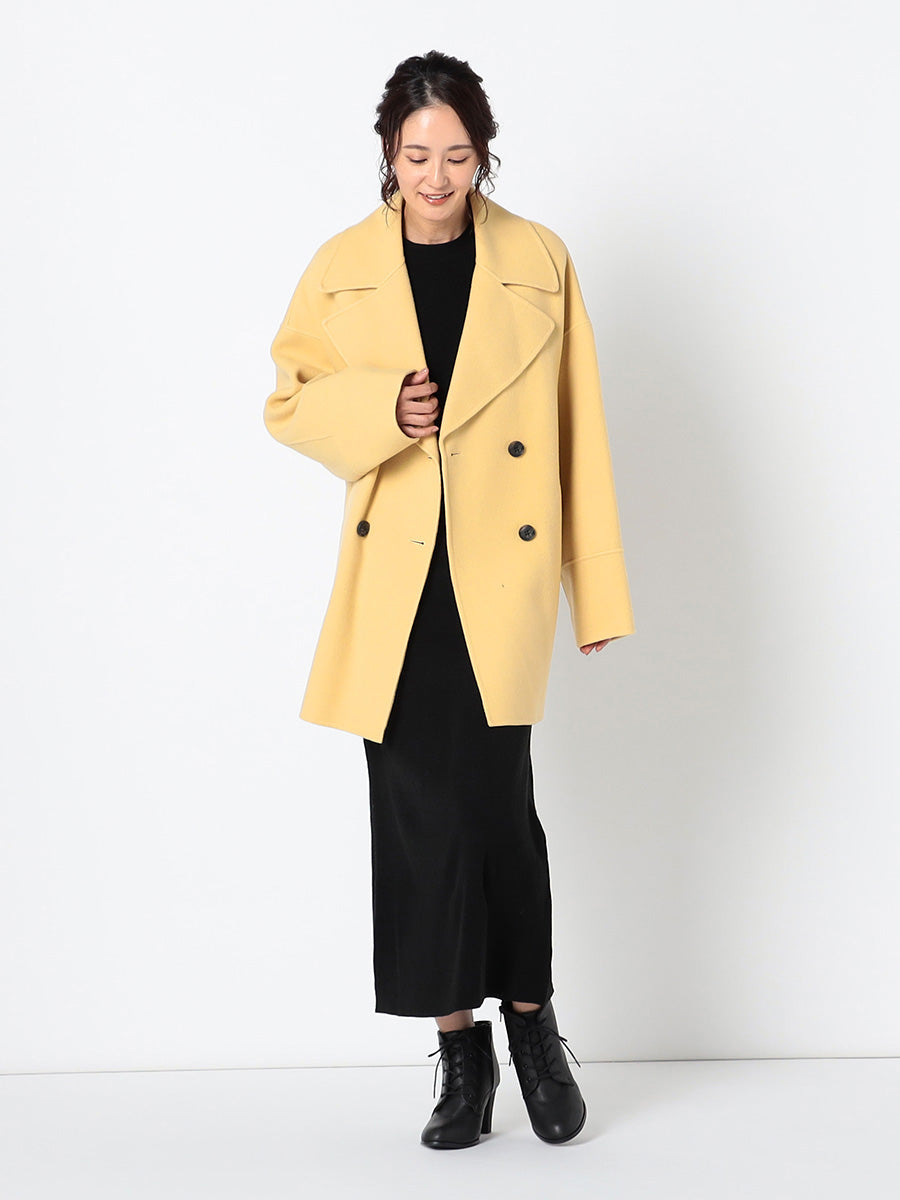 ・大きめの衿とダブルボタンがポイントのミドル丈コート
