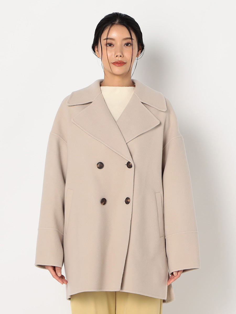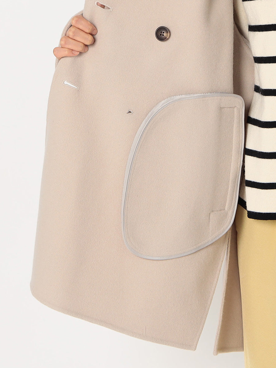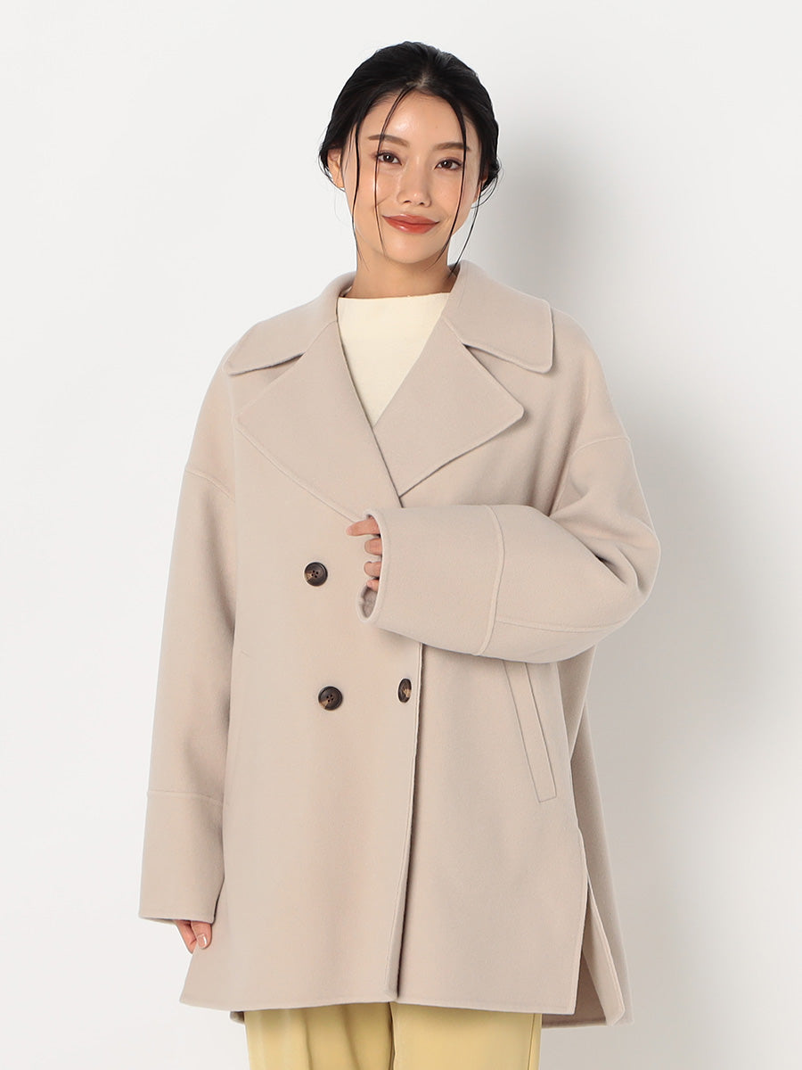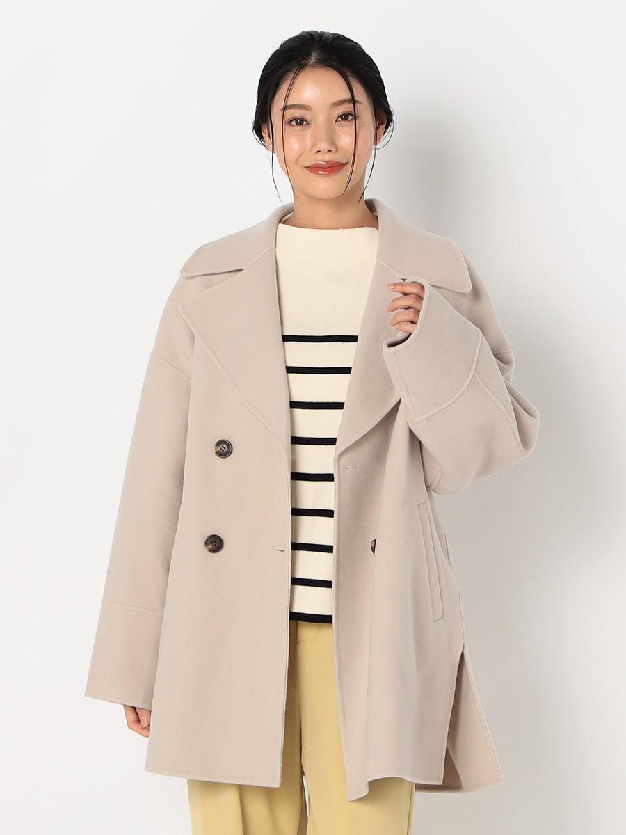・大きめの衿とダブルボタンがポイントのミドル丈コート
