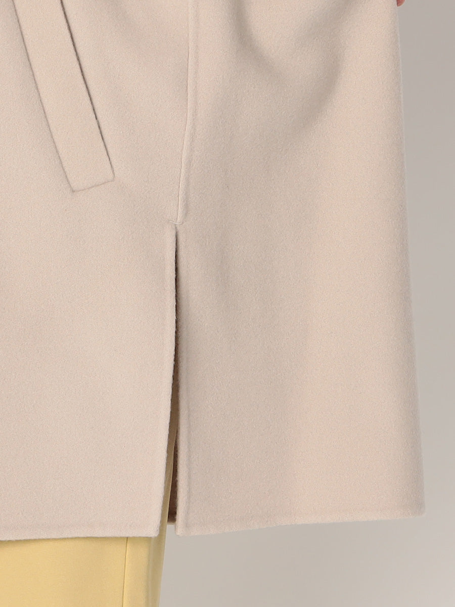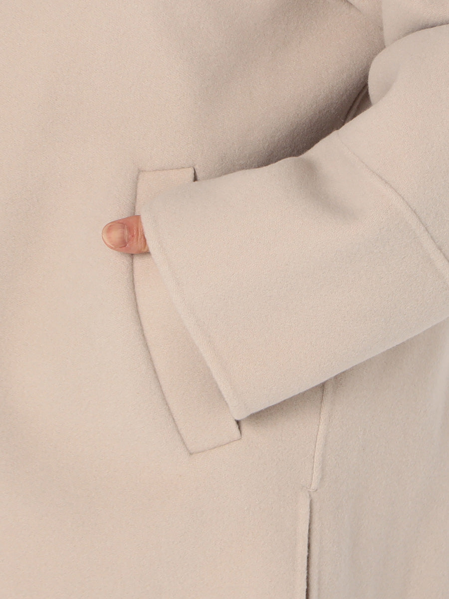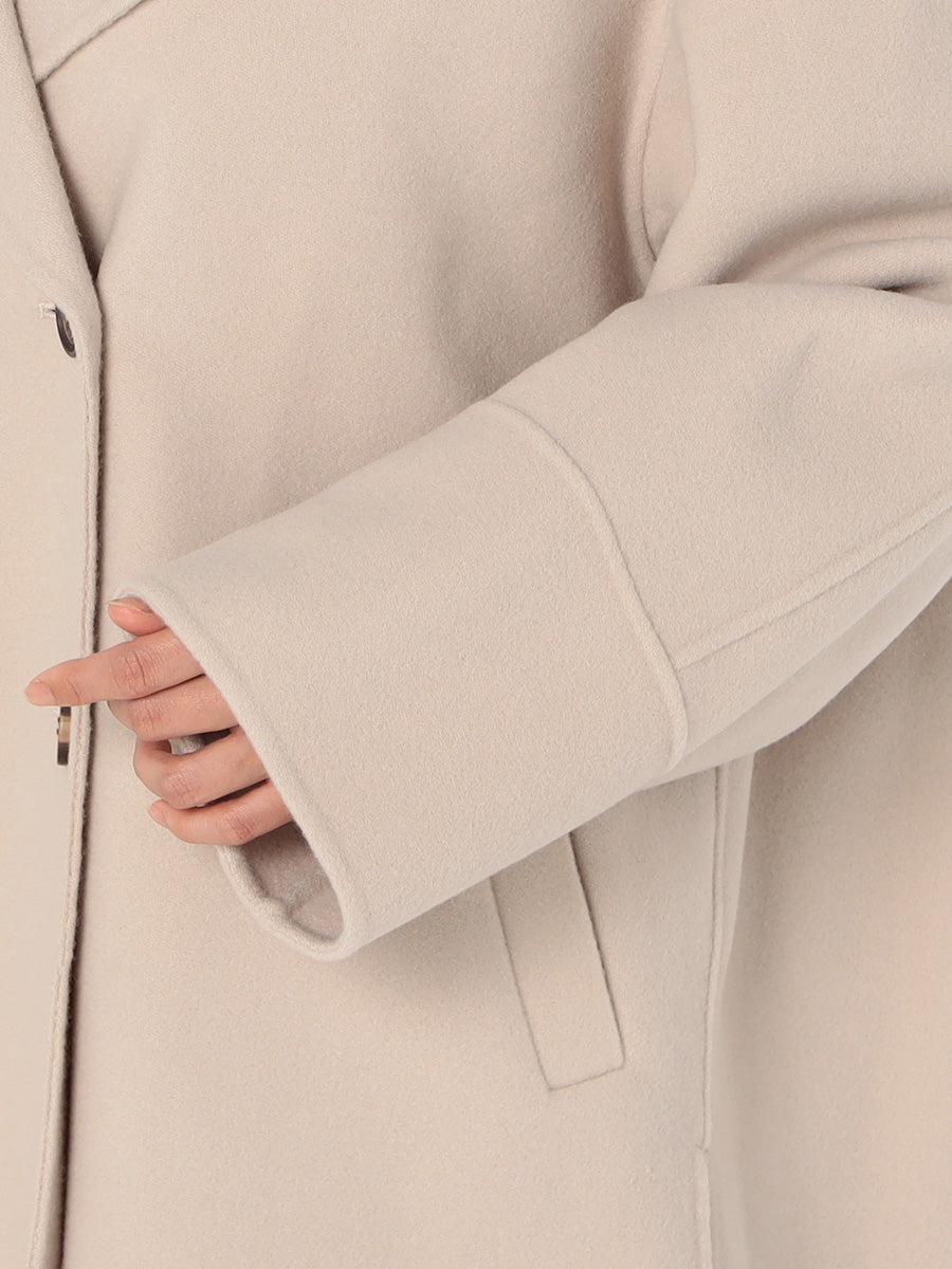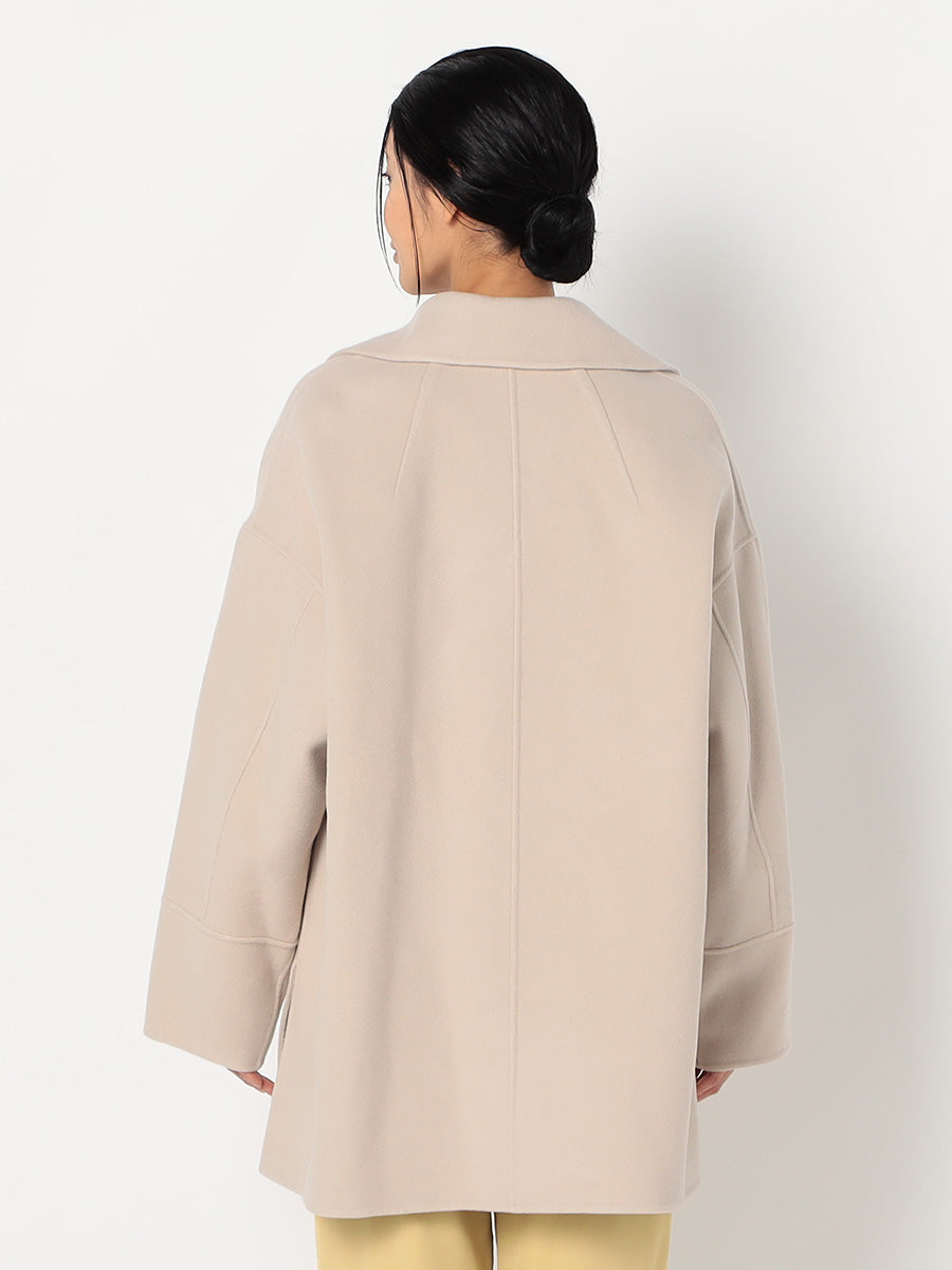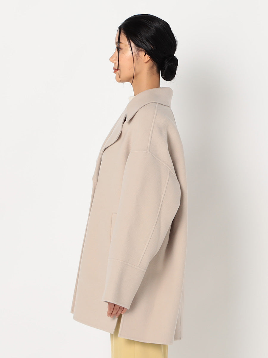 軽くふわっと柔らかな風合いのラムウールのみを使用したミドル丈コート。大きめの衿とダブルボタンがポイントで、ゆったりとしたシルエットが抜け感のある印象に。高級感ある素材を生かしたエレガントなスタイルだけでなく、カジュアルなアイテムとも合わせられるアイテムです。