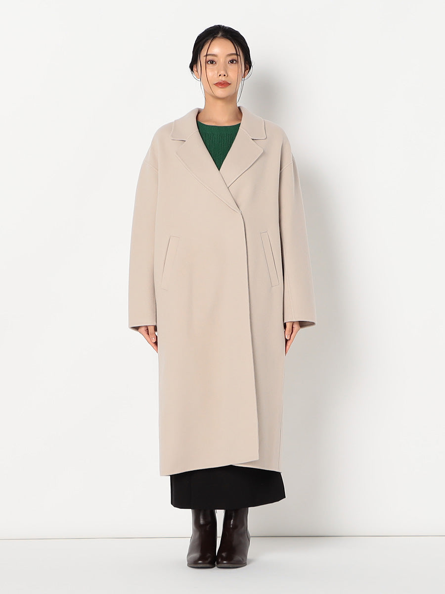 ・高級感ある素材と美しい縦長シルエットが目を引くロングコート